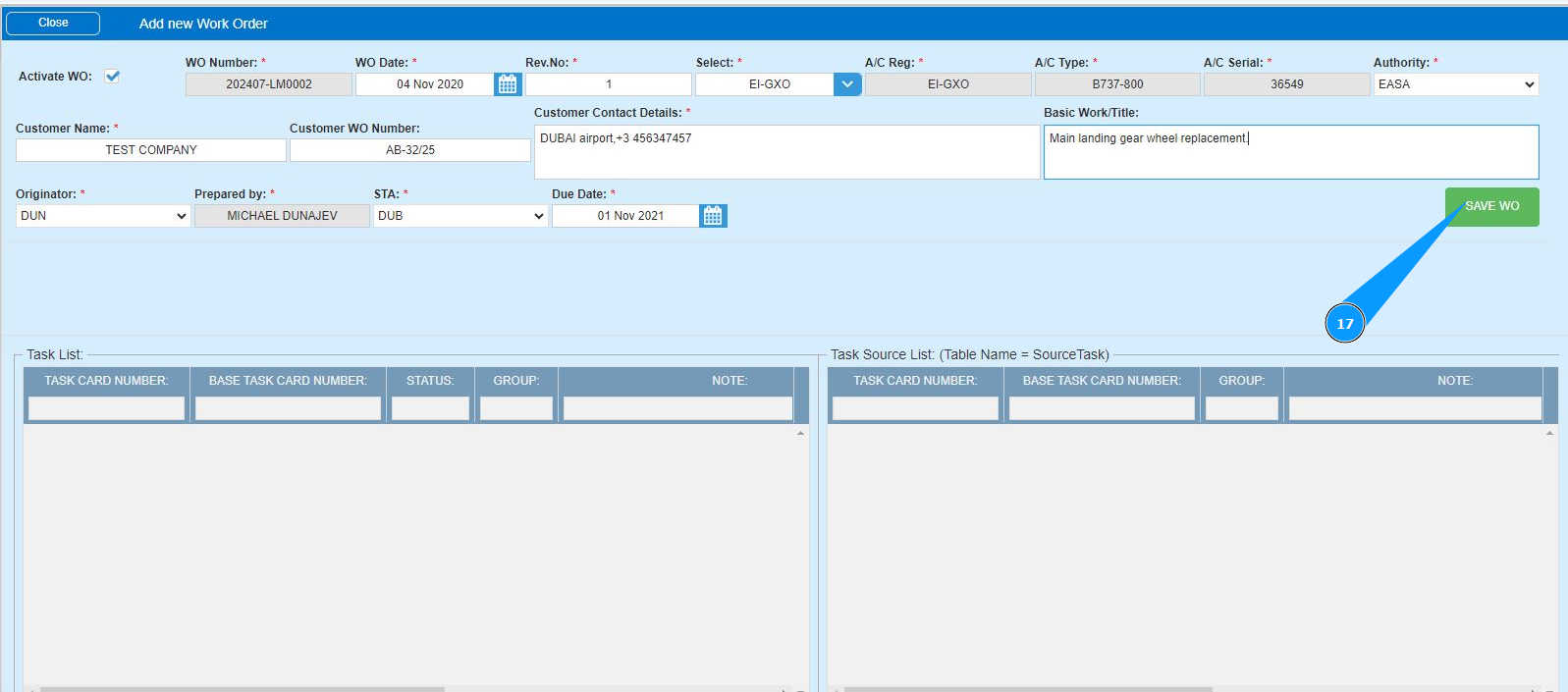 17. Click on the button "Save" to save the entered data for opening a WO into the program.