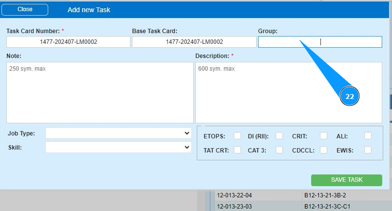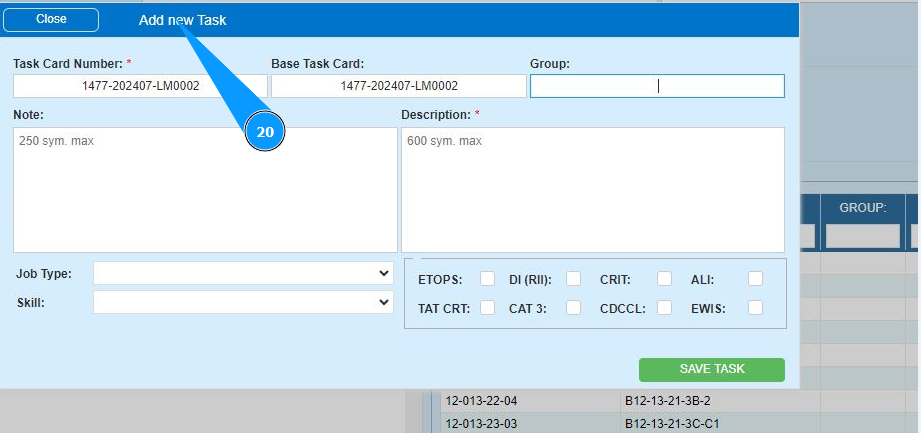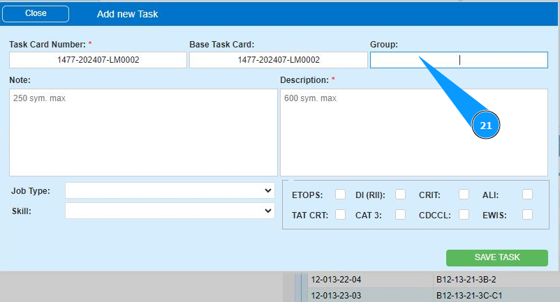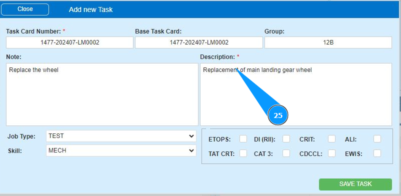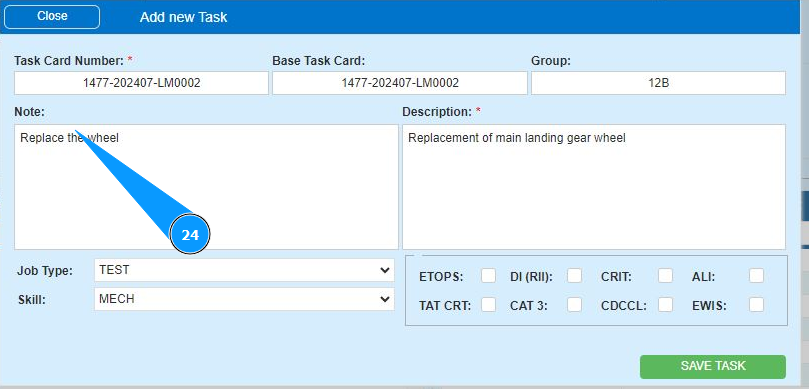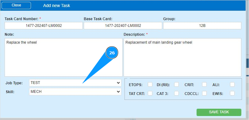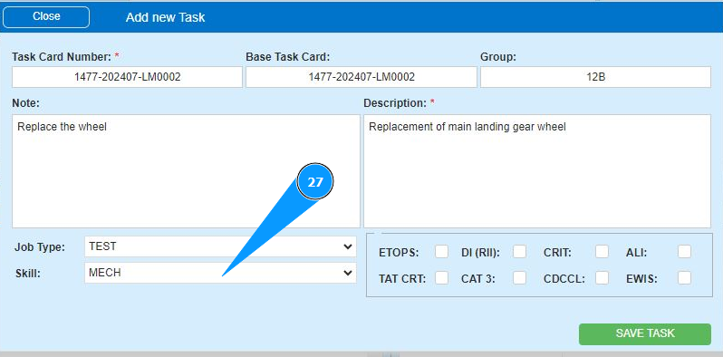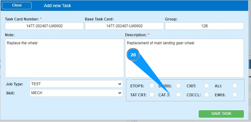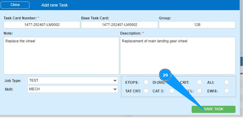 28. If necessary, enter additional criteria for completing the task in the fields: "Etops", "DI(RII)", "CRIT" and so on.