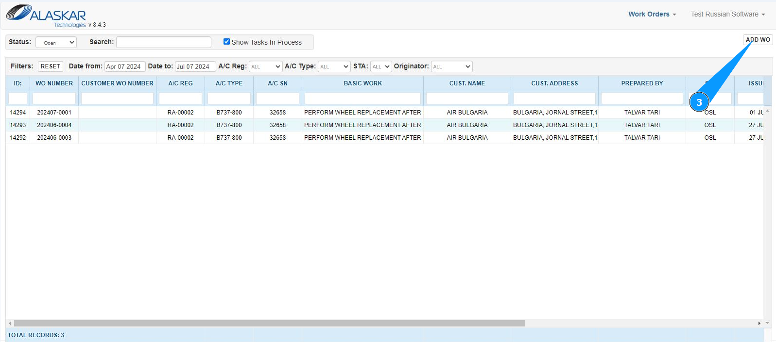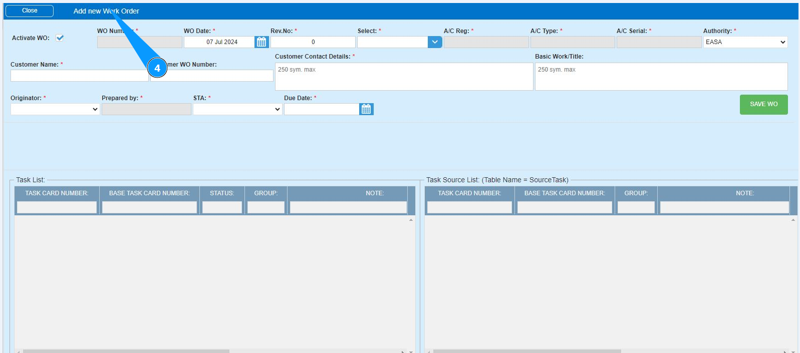 3. Click on the button "Add WO" to enter the WO opening mode.