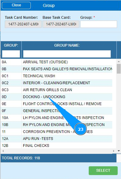 7. Select the aircraft registration number from the dropdown list in the field "Select". Note: The fields "A/C Reg., A/C Type, A/C Serial No." will be filled in automatically by the program.