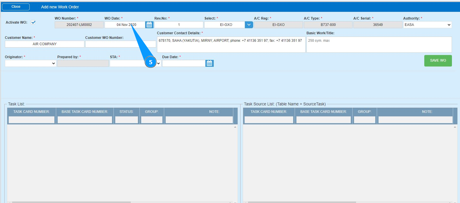 5. Enter the WO opening date in the field "WO Date" or select it in the calendar. Note: The work order number is generated automatically in the field "WO Number".