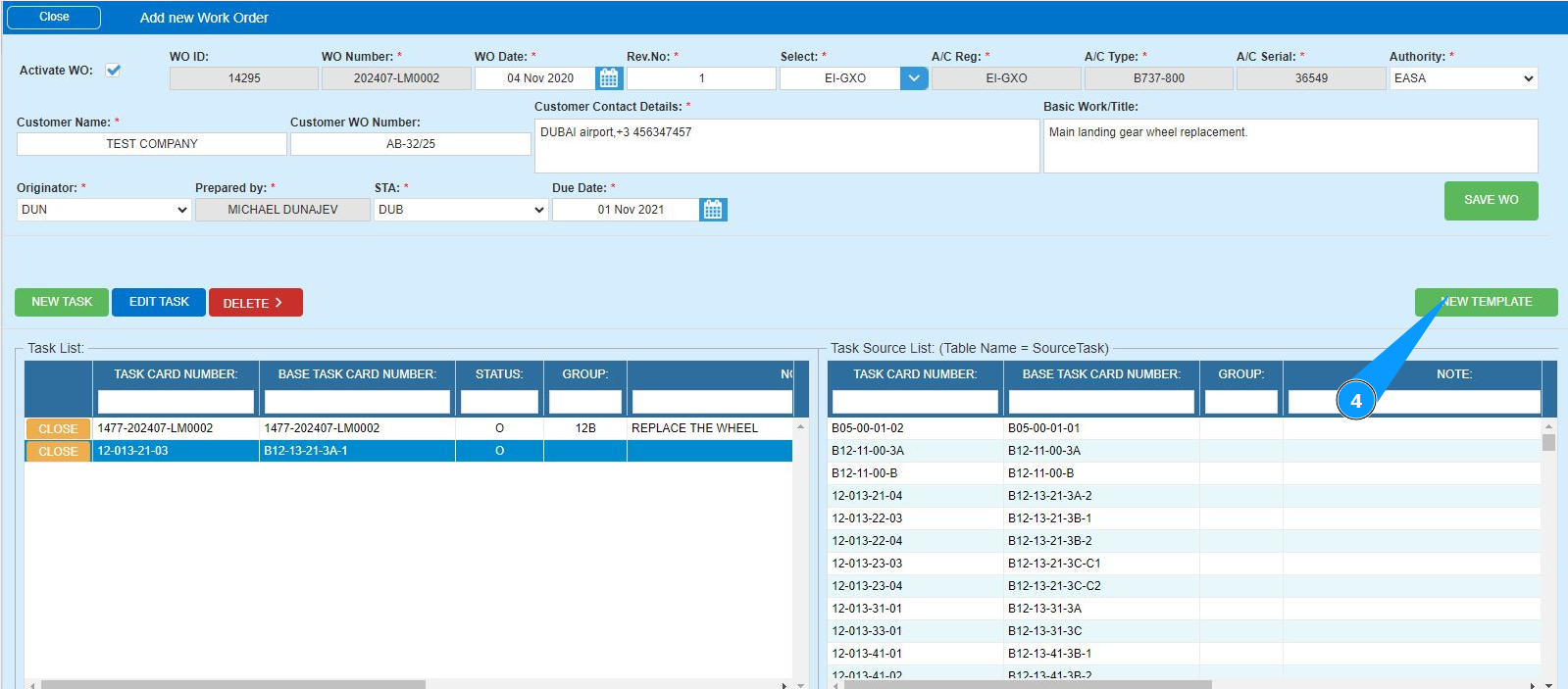 17. Make sure that the new template task is displayed in the window "Task List". Note: If necessary, to add a task to the work order, click on the button "Add Task".