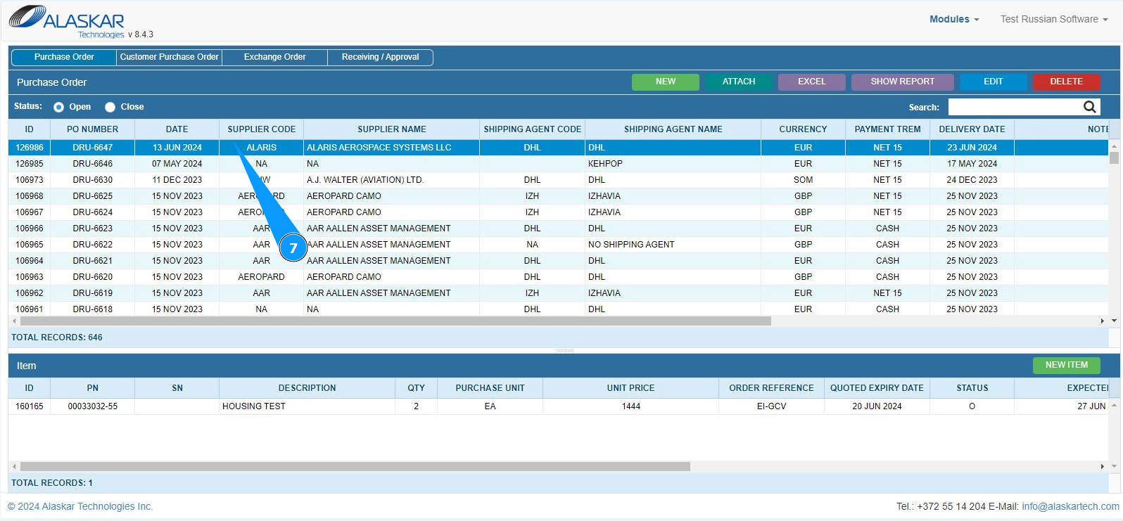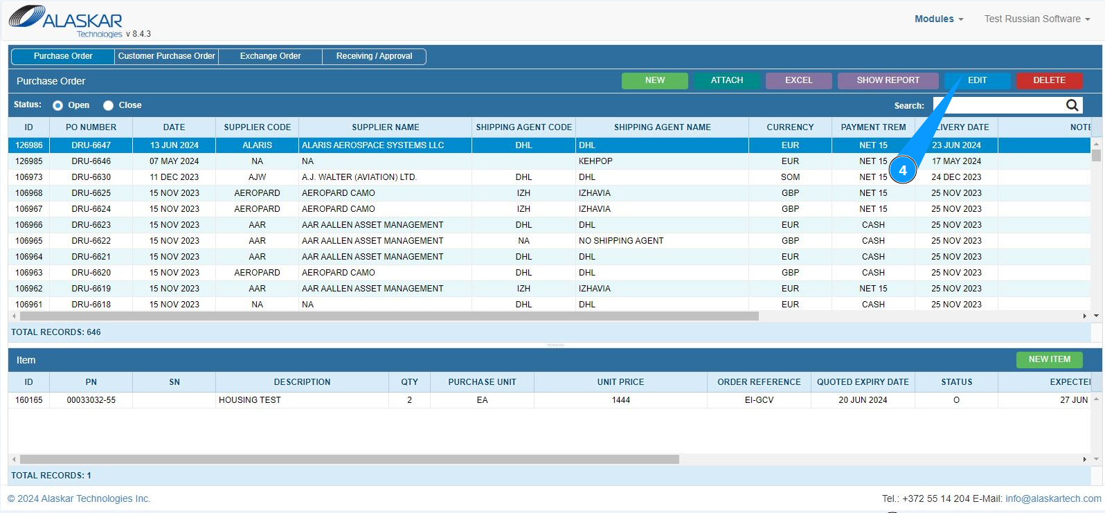 3. Select the required record for editing Purchase order and click on the corresponding line.
