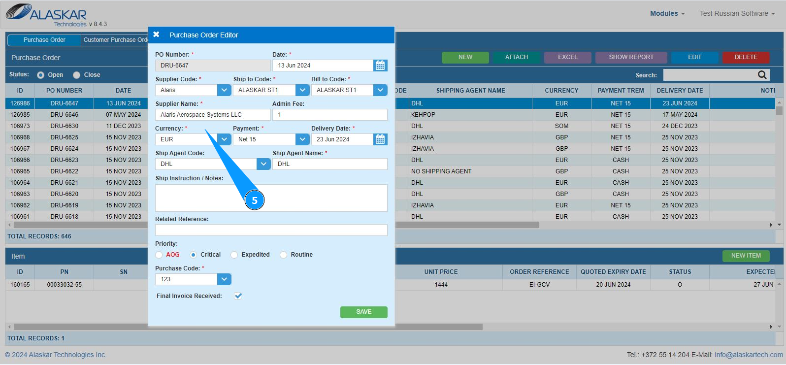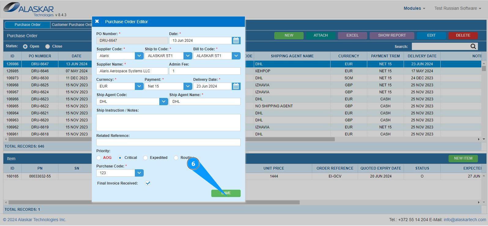 6. Click on the button "Save" to save the changed PO data to the program.