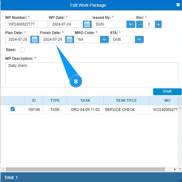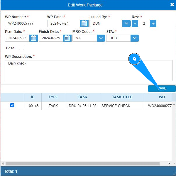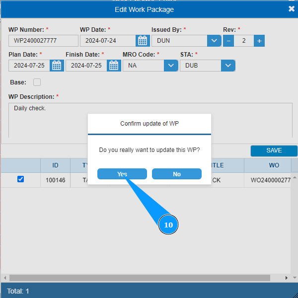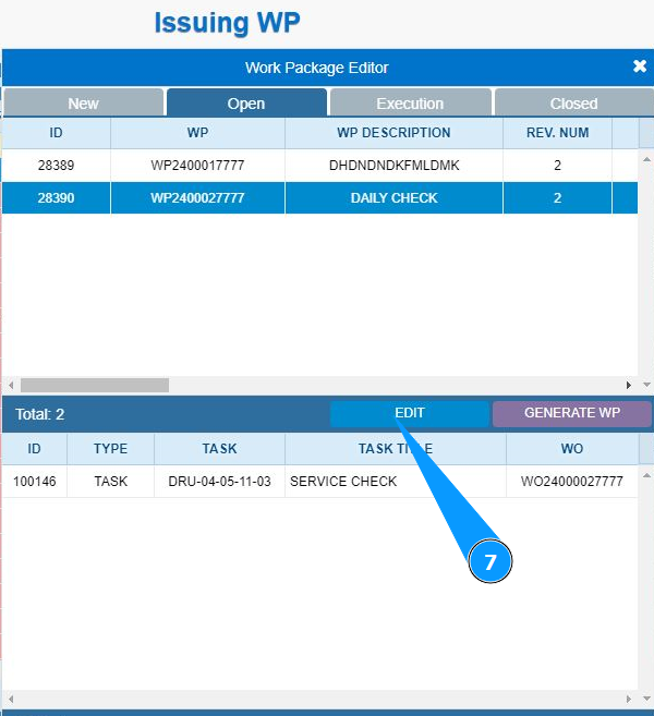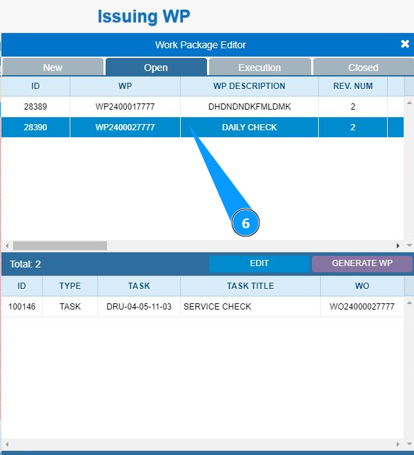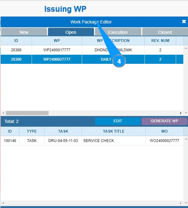 6. Select the work package required for editing from the list and click on the corresponding line.