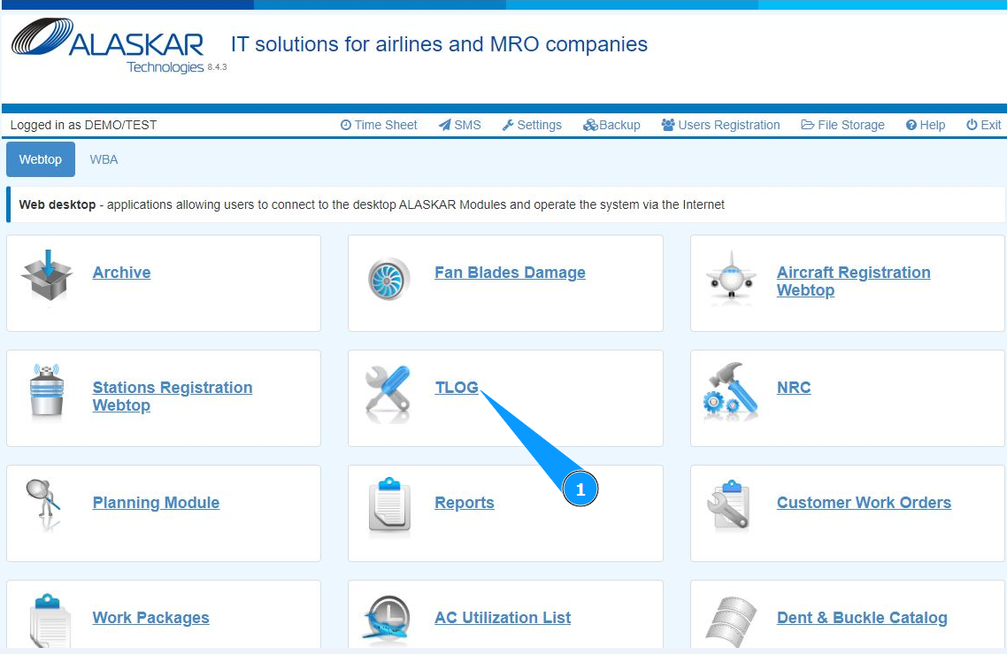 1. In order to enter data into aircraft technical logbook, go to the submodule "TLOG".