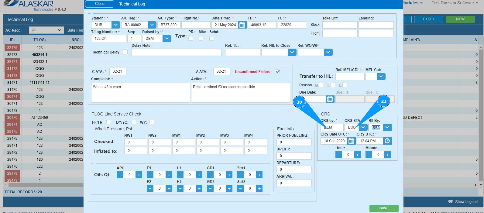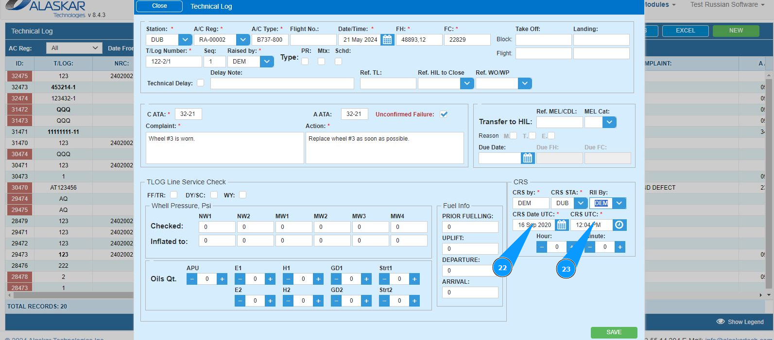 22. Enter the date when the CRS was issued in the field "CRS Date UTC". Note: If necessary, enter information about man-hours in the fields: "Hour", "Minute".
