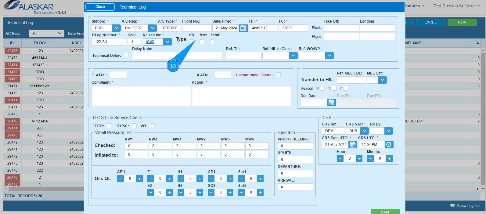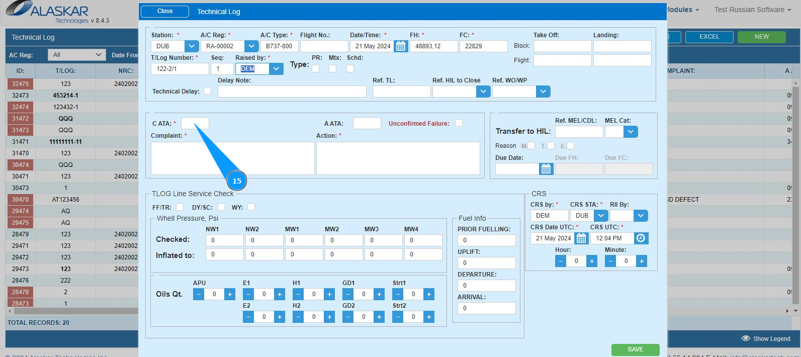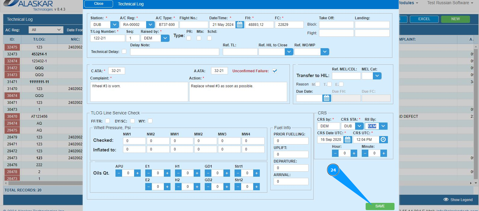 25. Check that a record appears with the entered data in the window "Technical Log".
