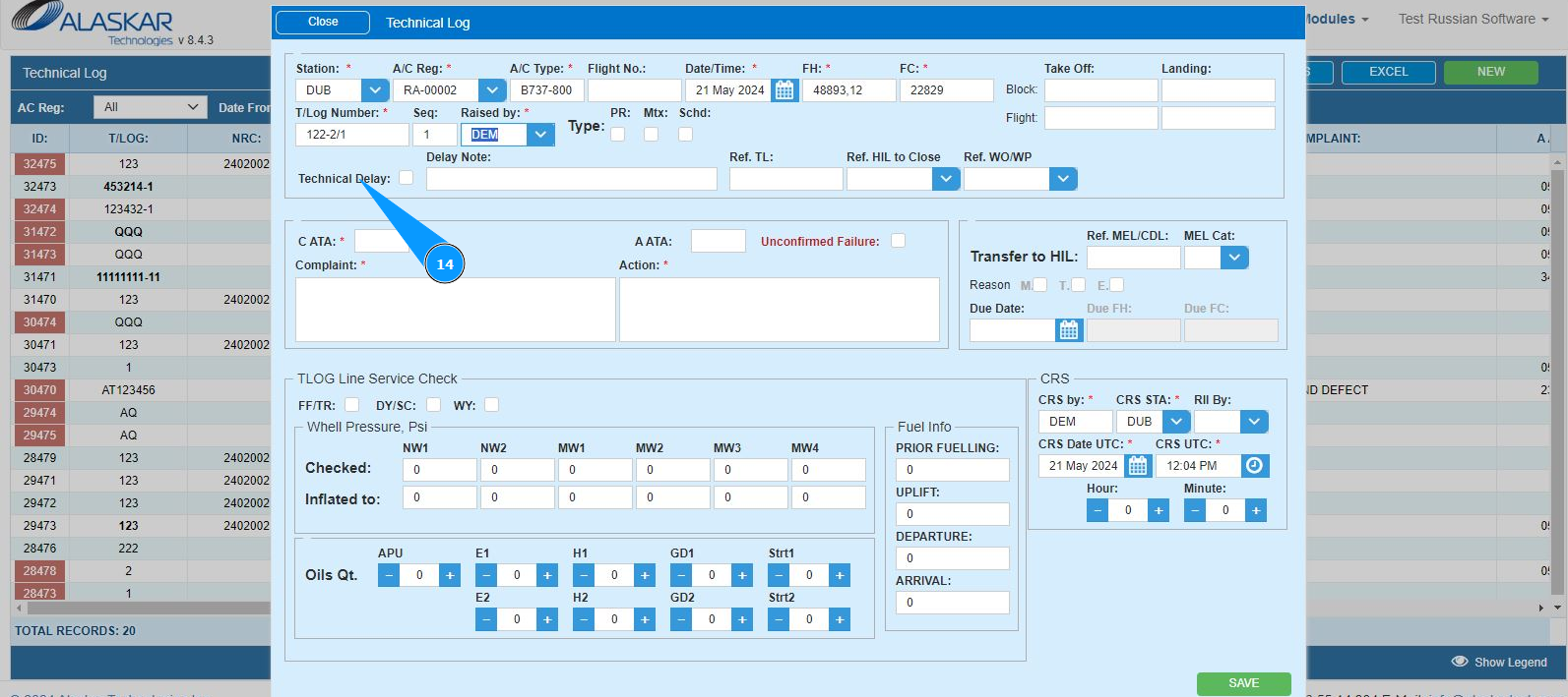 14. If you need to register a flight delay, enter data in the fields: "Delay Note", "Ref.TL", "Ref.HIL to Close", "Ref.WO/WP" of window "Technial Delay" and tick.