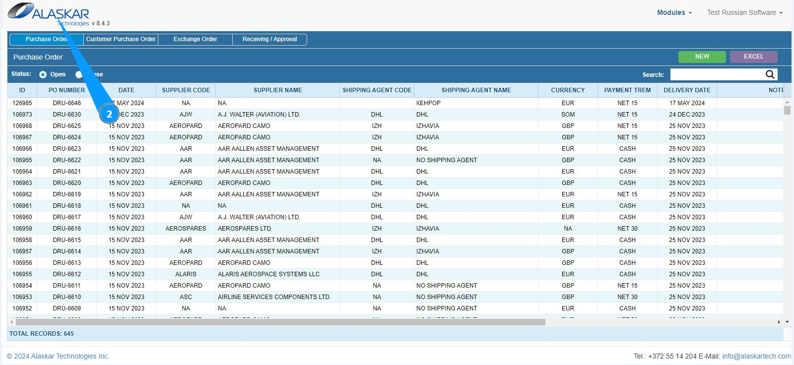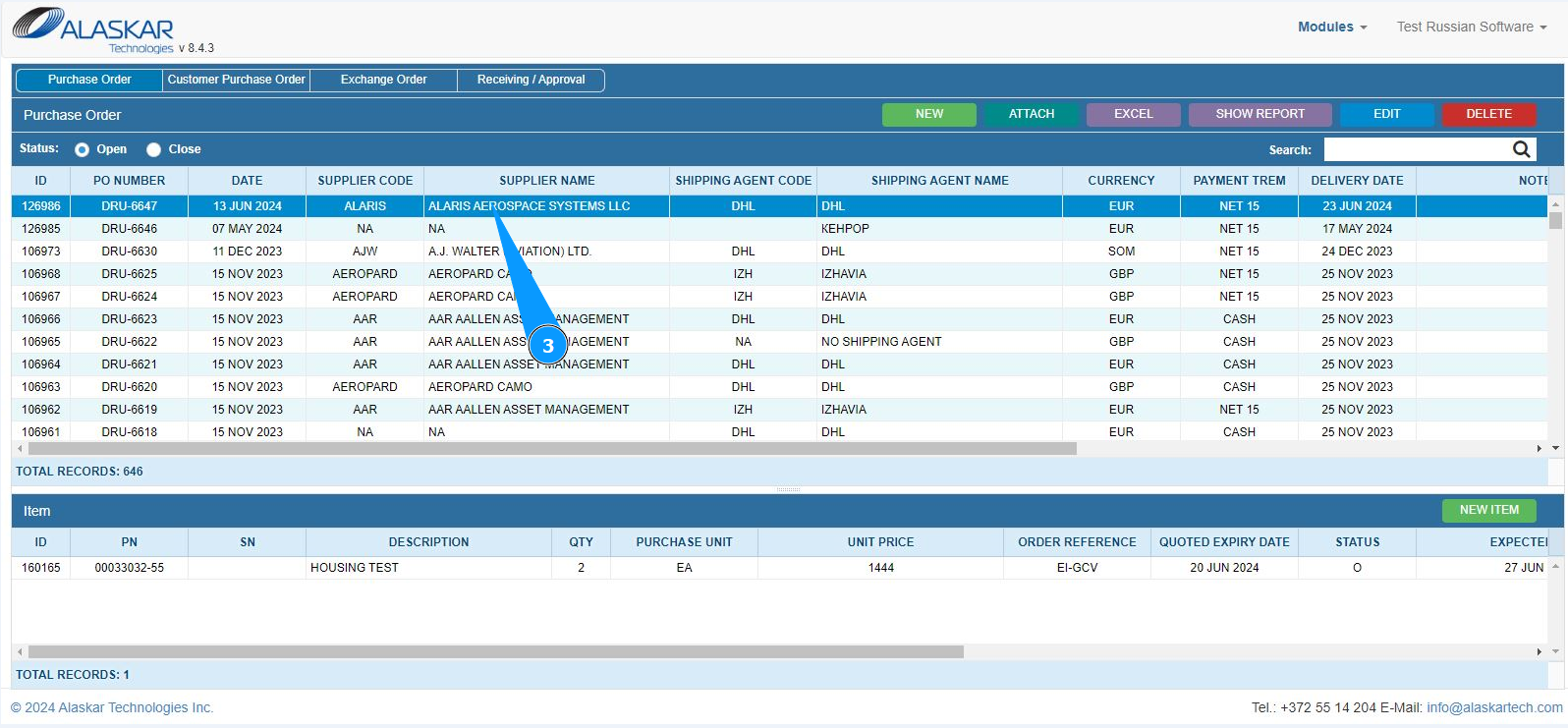 2. Make sure that the window for working with PO is open and accessible in the window "Purchase order".