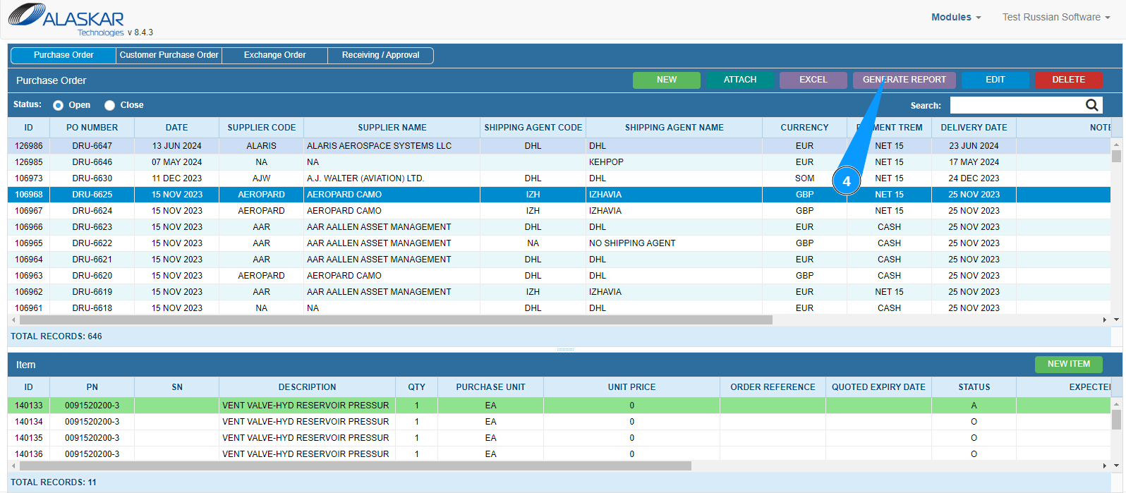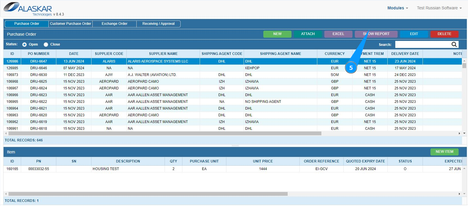 5. Check that the report has been generated and is available. Click on the button "Show Report" to display the PO report on the screen.