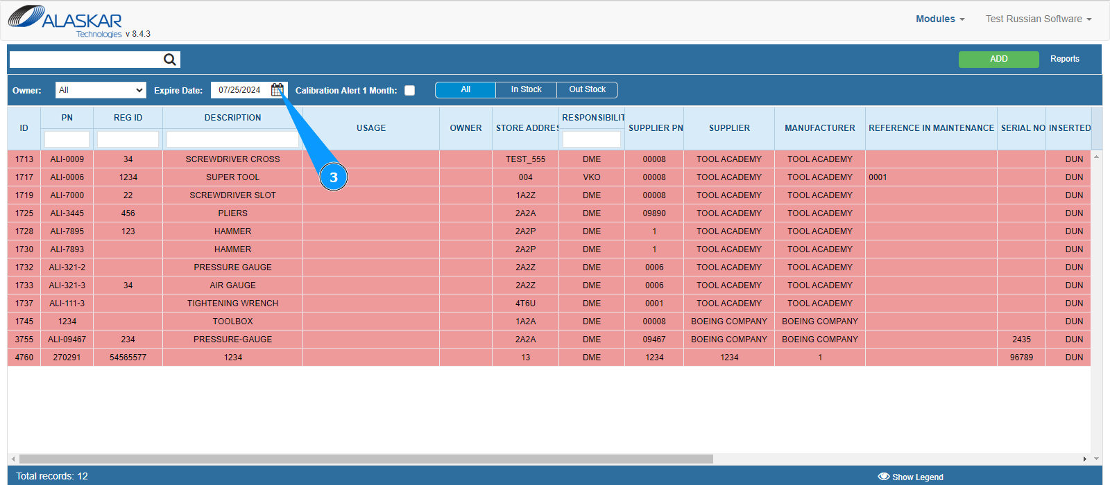 3. If necessary, enter the date on which you want to filter the calibrated or verified tool in the field "Expire Date".