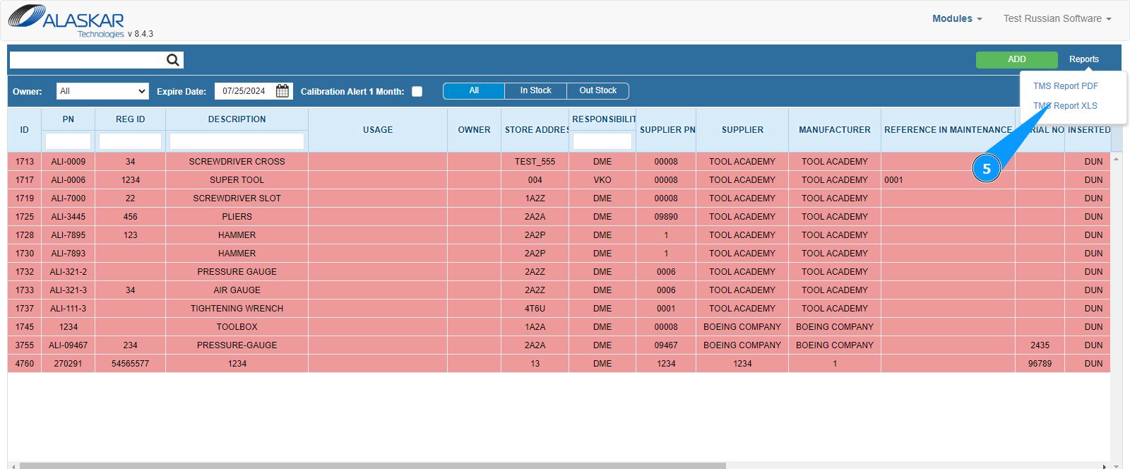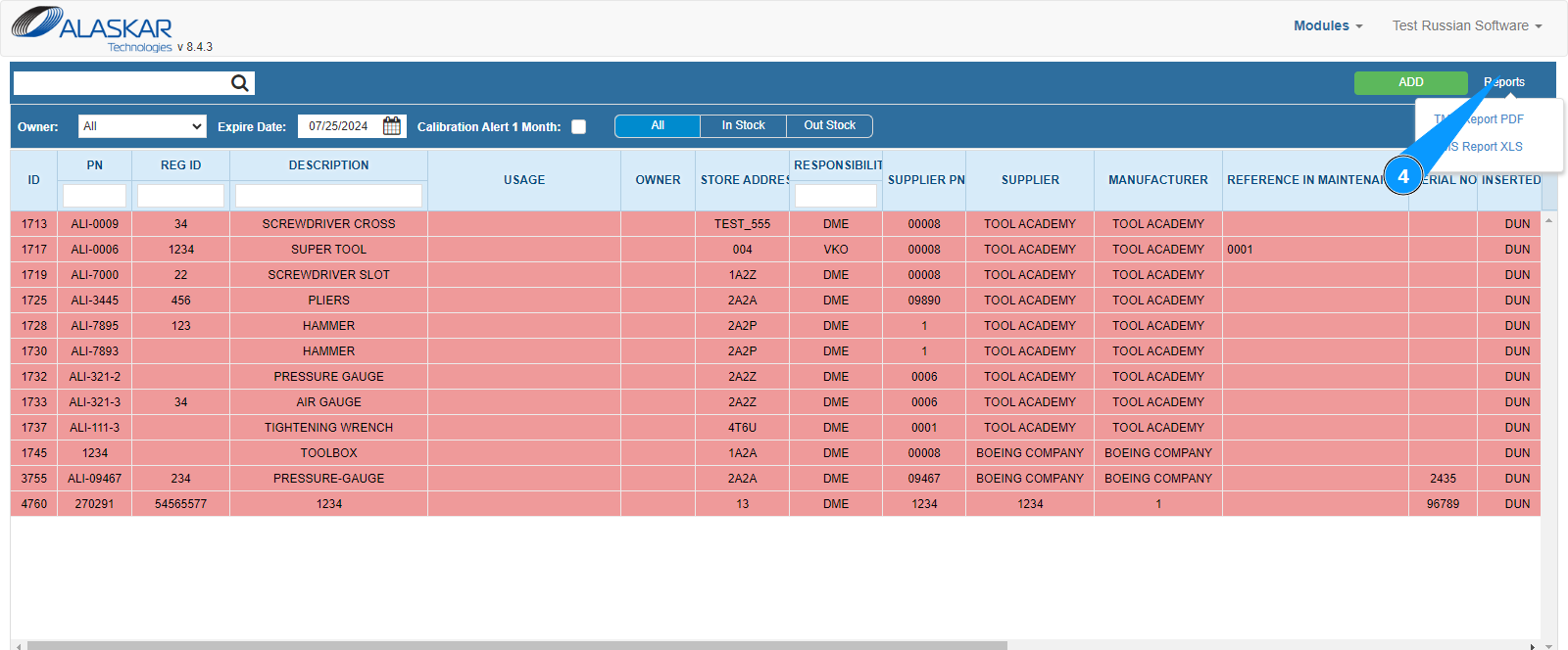 Note: Use the available filters to get the tool report in the fields "Owner", "All", "In Stock" and "Out Stock".
