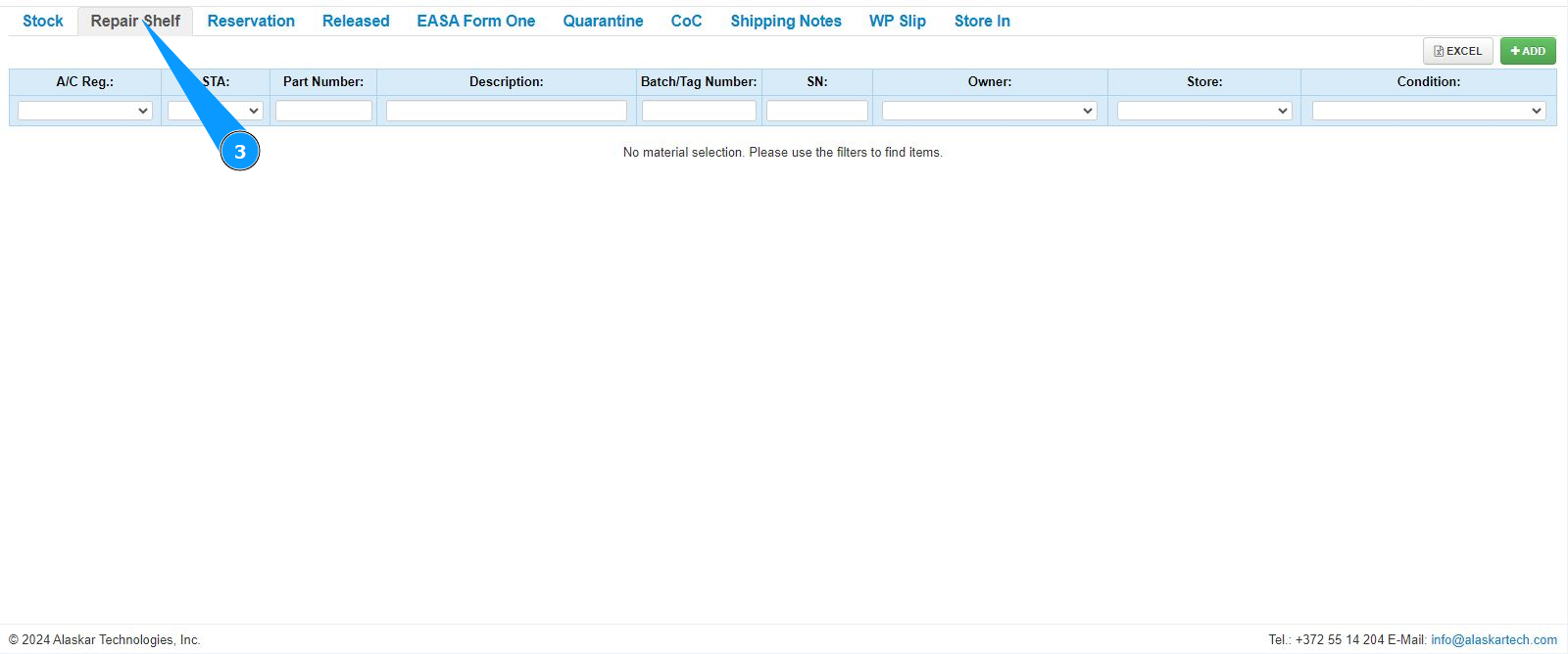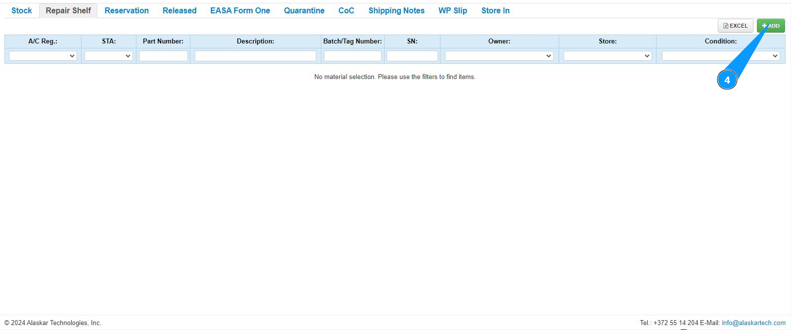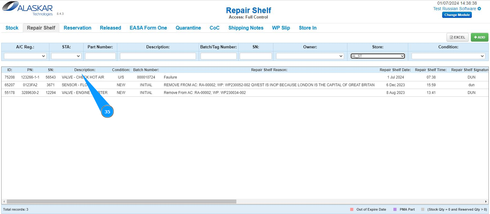 1. In order to receive a component on the repair shelf of the store, go to the submodule "Stock".