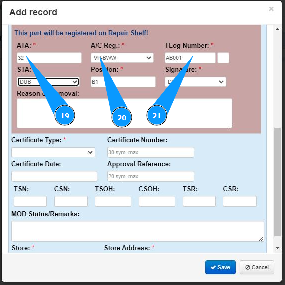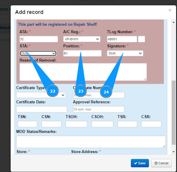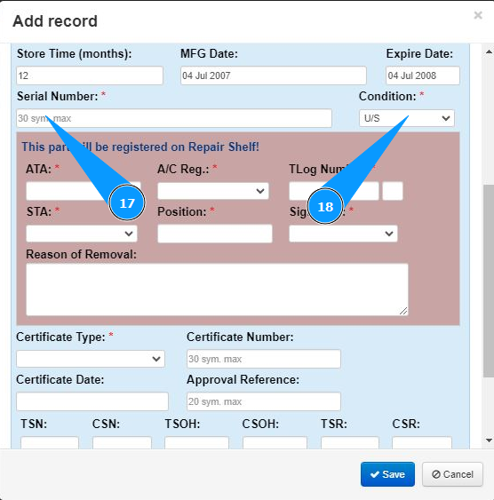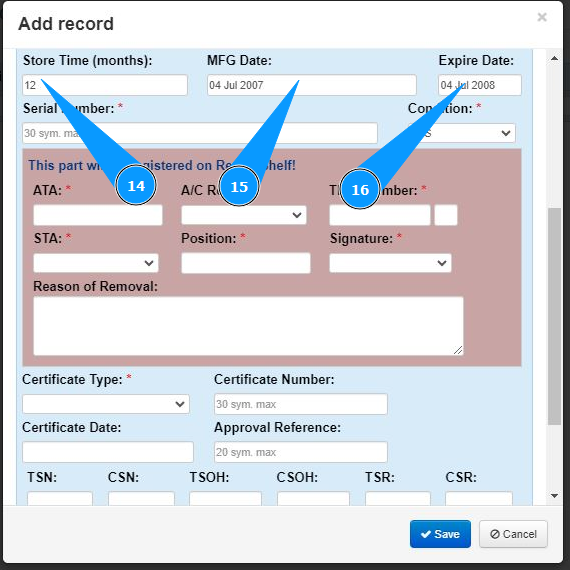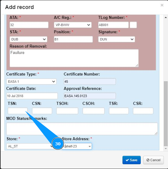 30. If necessary, enter information about the operating time of the component from the first operation date, from the date of overhaul or from the date of repair in the fields: "TSN", "CSN", *"TSOH" *, "CSOH", "TSR", "CSR".