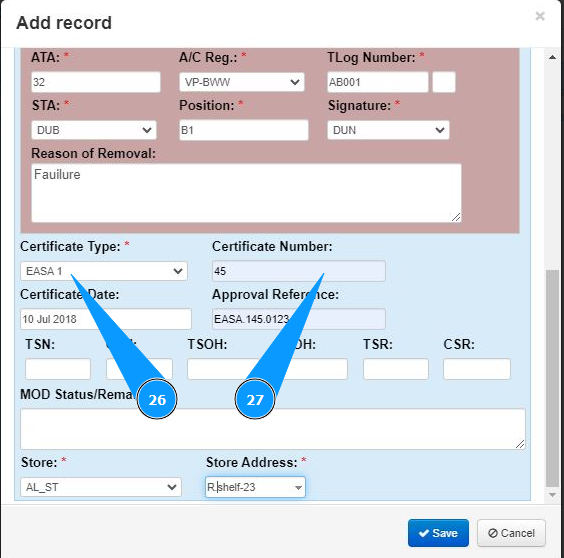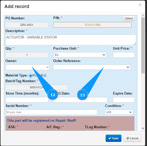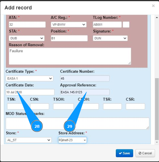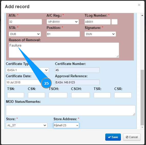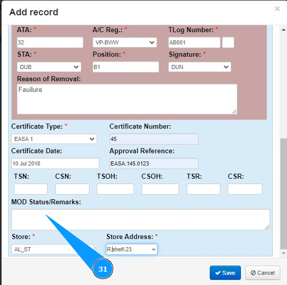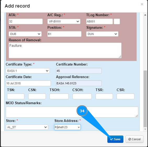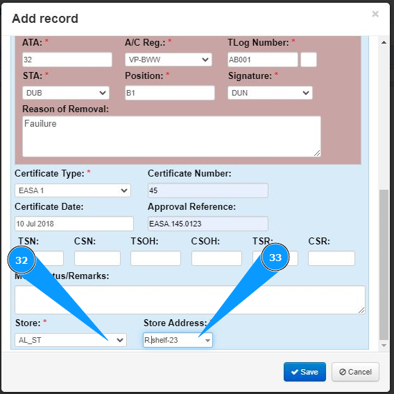 33. Enter the component storage repair shelf number in the field "Store Address".