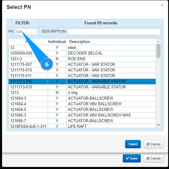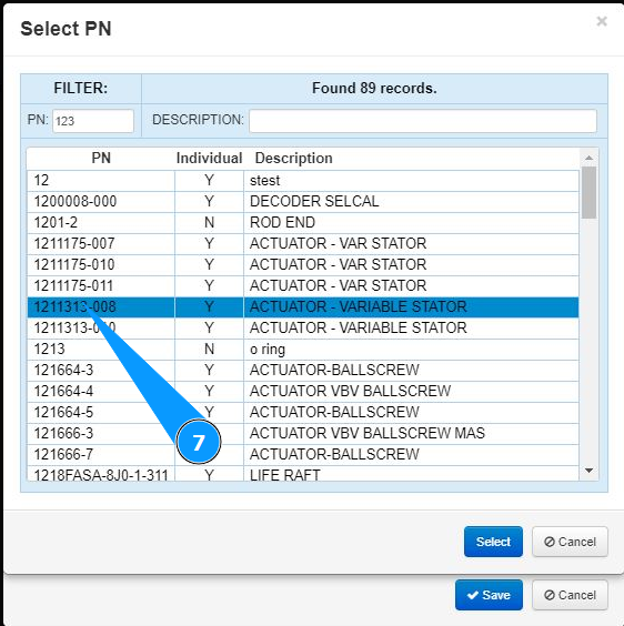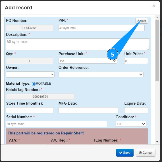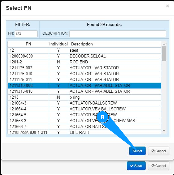 5. Click on the button "Select" to go to the p/n entry editor. Note: The order number will be entered automatically in the field "PO Number".