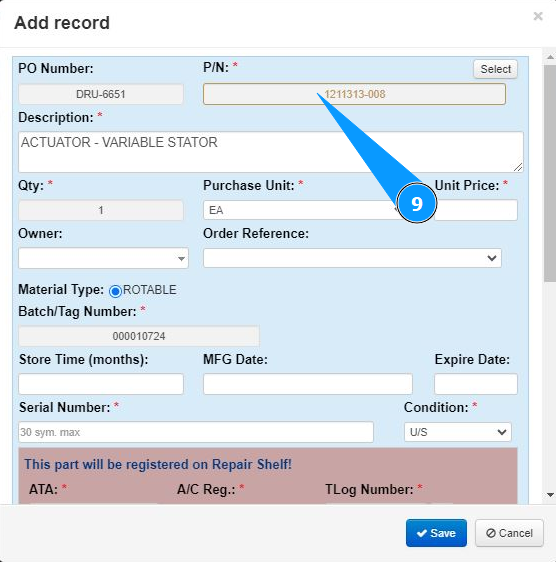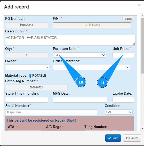 10. Select the component unit from the dropdown list in the field "Purchase Unit". Note: The quantity of received components will be entered by the program automatically in the field "Qty".