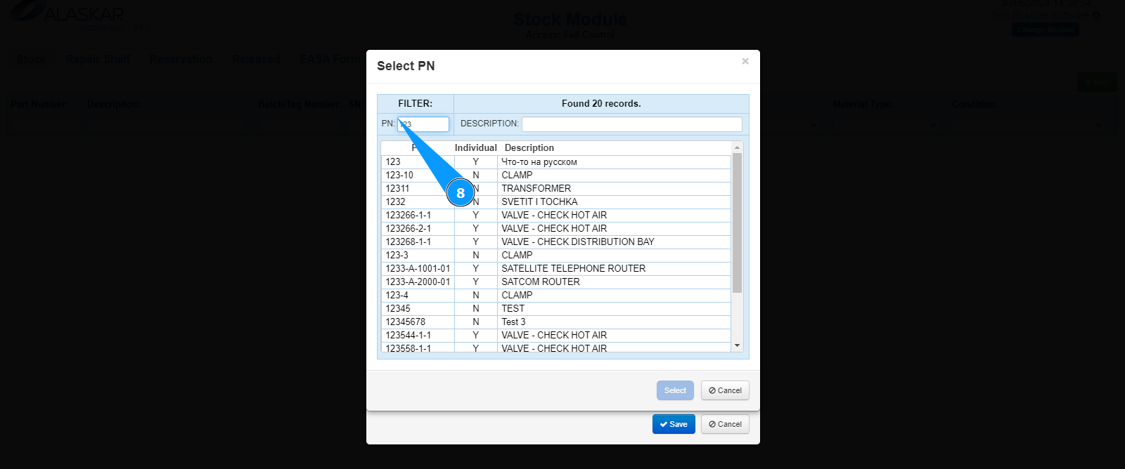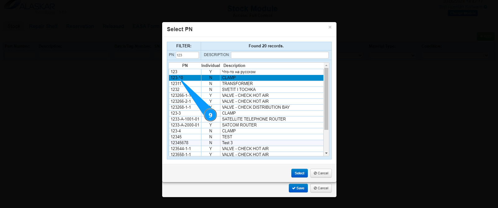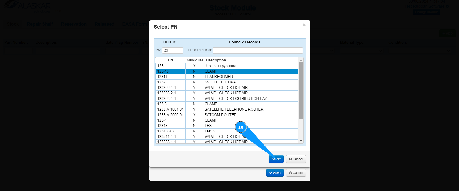 7. Click on the button "Select" to go to the p/n selecting editor.