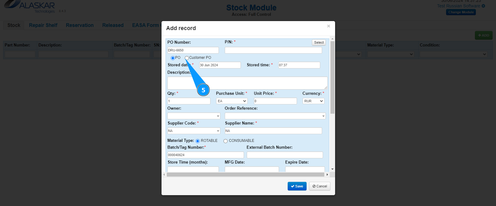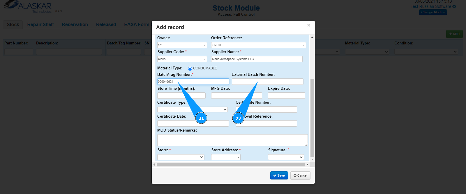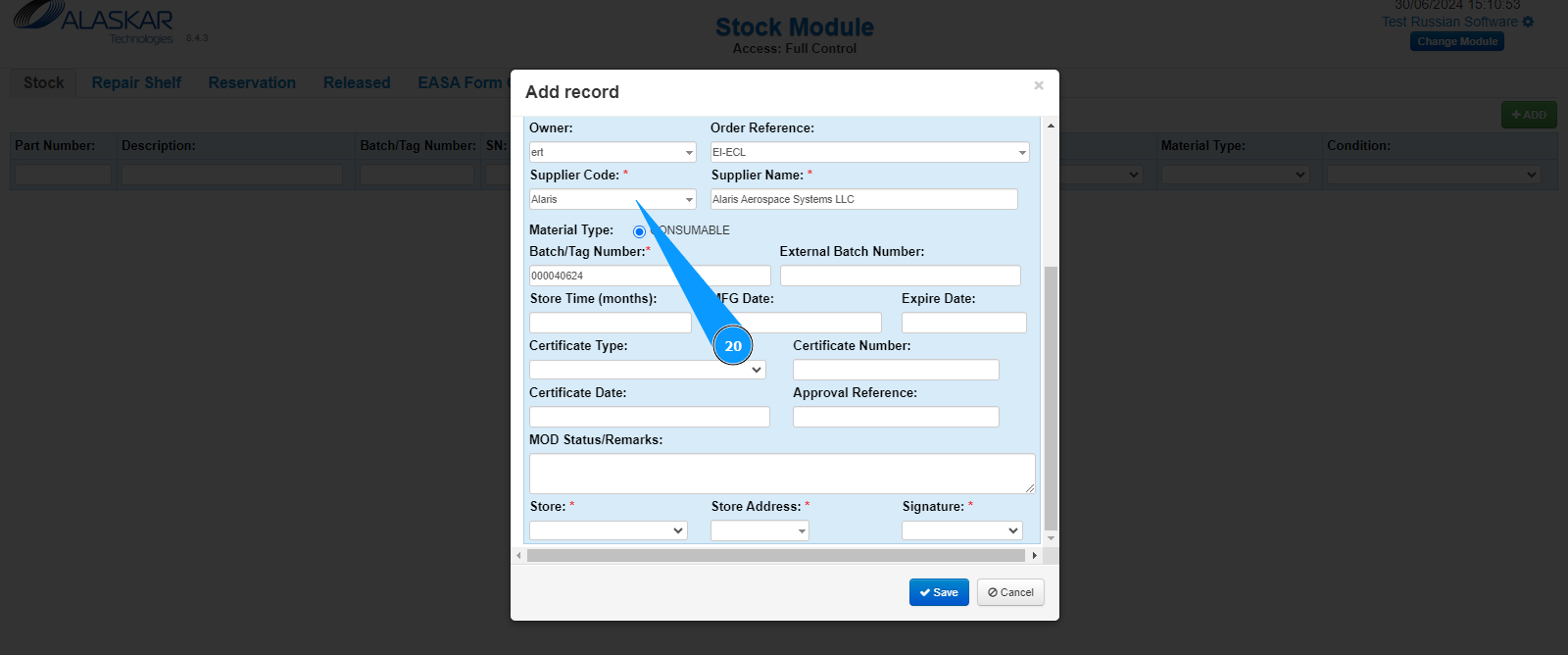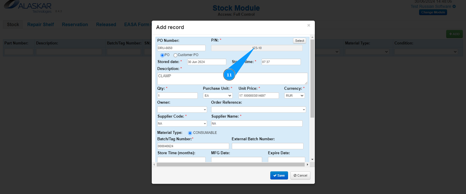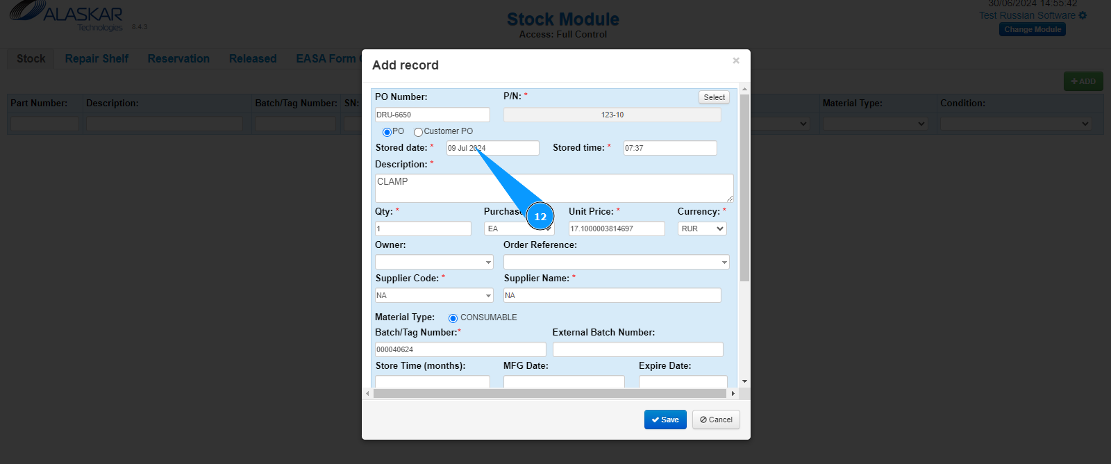 12. Enter the receiving date in the field "Stored Date" or select from the calendar.