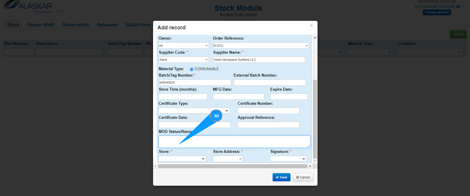 30. If necessary, enter comments on modifications, storage criteria, or others in the field: "Mod Status/ Remarks".