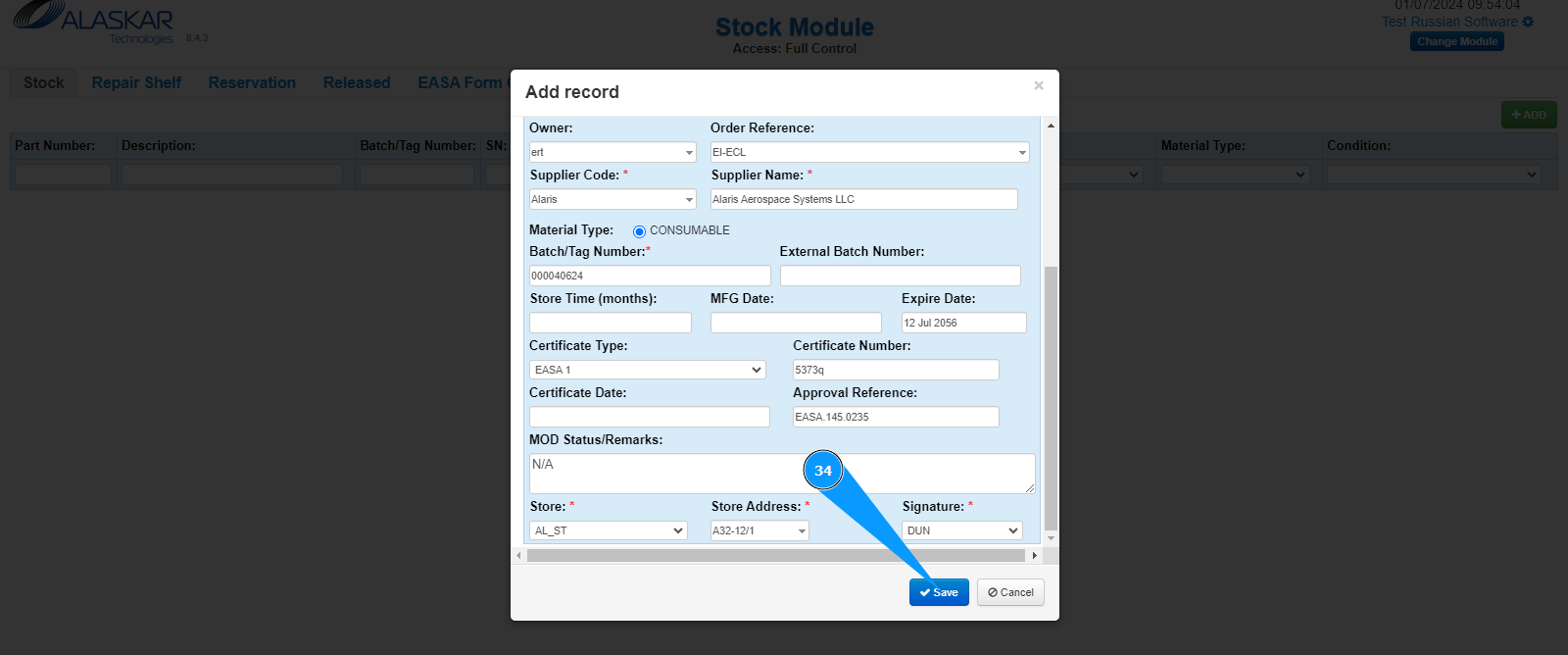 33. Select from the dropdown list the login of the personnel who accepted the component to the store in the field "Signature".