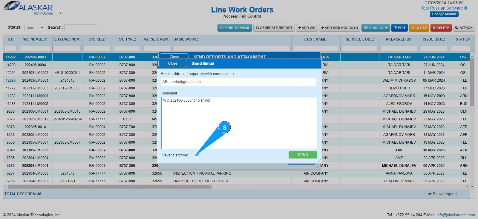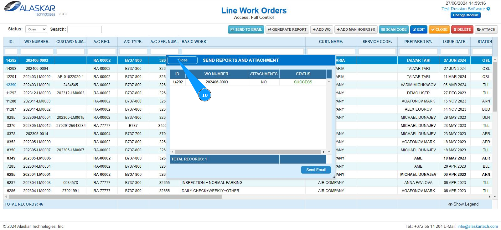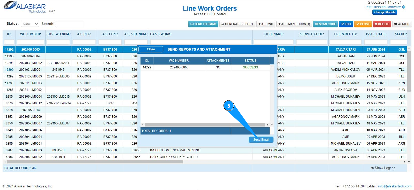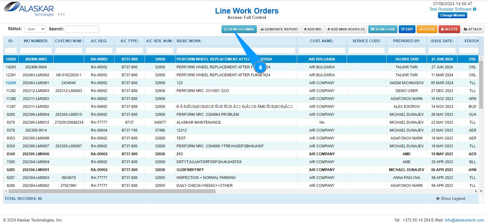 3. Select the corresponding line with LWO from the list, which should be sent by mail. Click on a line to highlight it. Note: If necessary, use the available search filters: "ID", "WO Number" and so on.