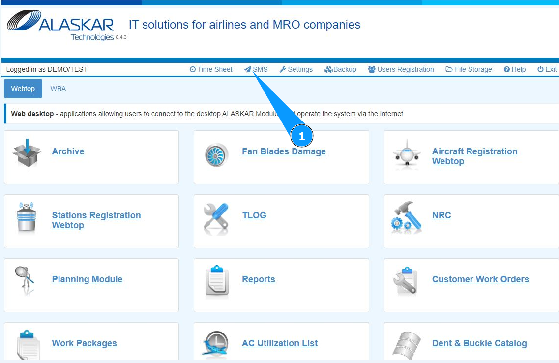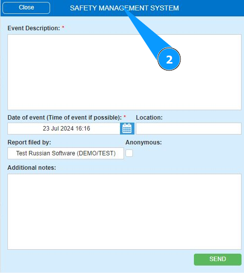 1. In order to send a report of an event of flight safety, at the top of the open center, go to the submodule "SMS".