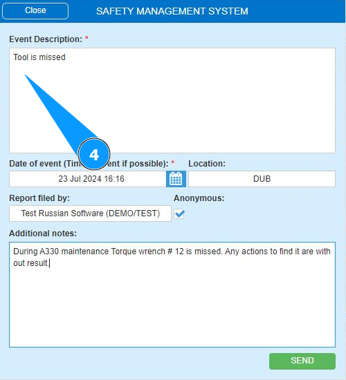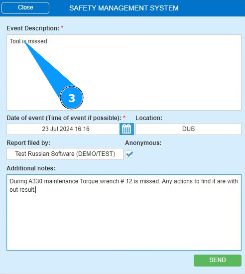 3. Enter information about the flight safety event or deviations in business processes (operational deviations) in the field "Event Description".