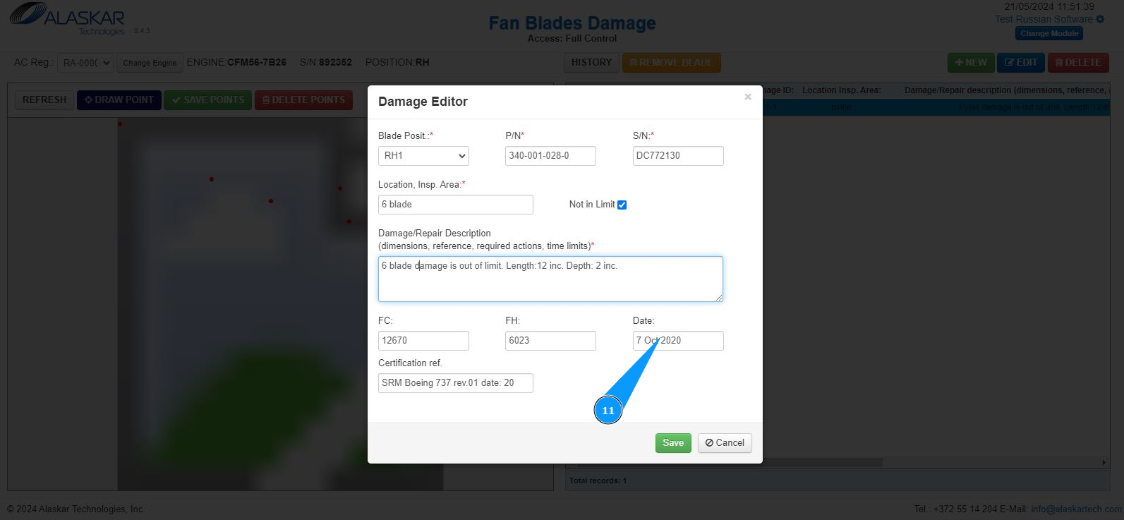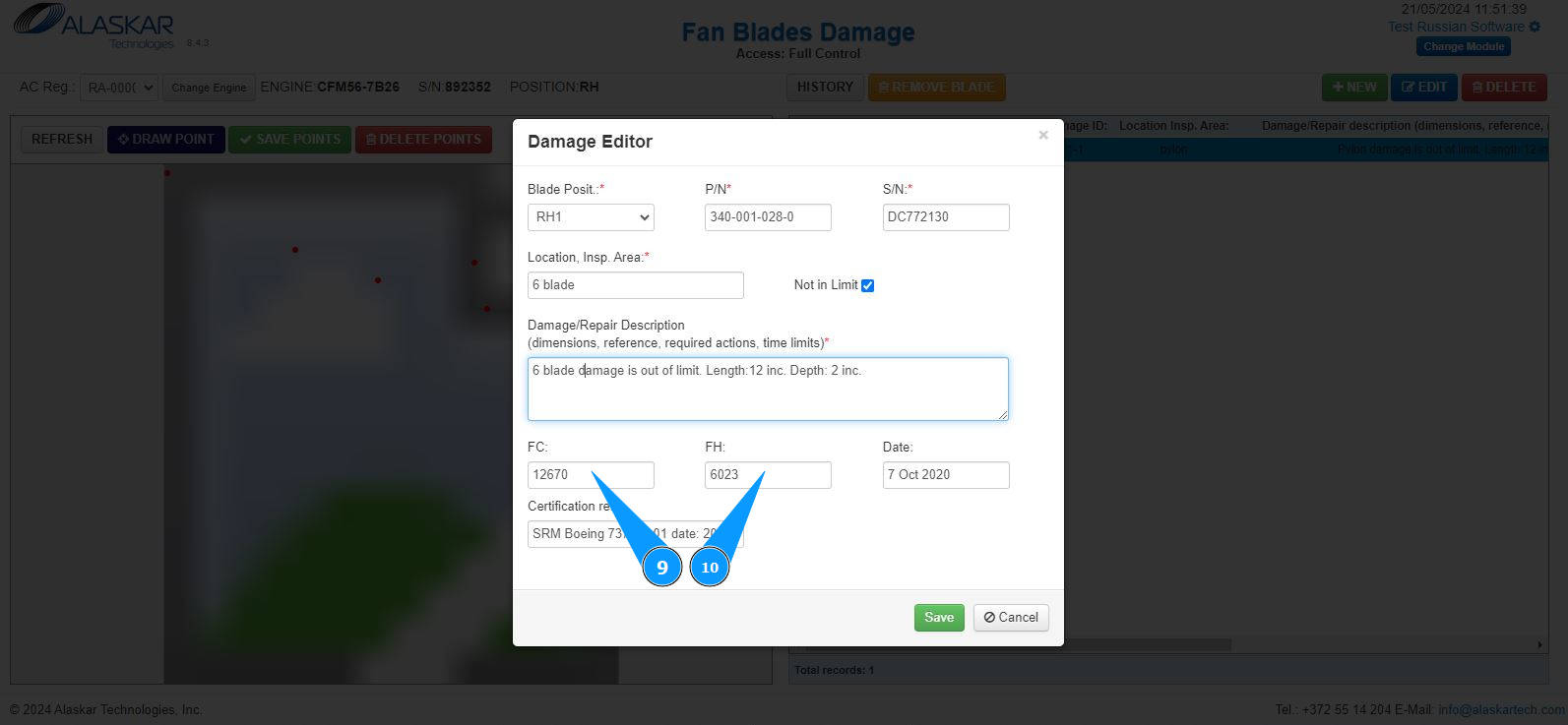 10. If necessary, enter information about the flight cycles in which the damage has been identified in the field: "FC".