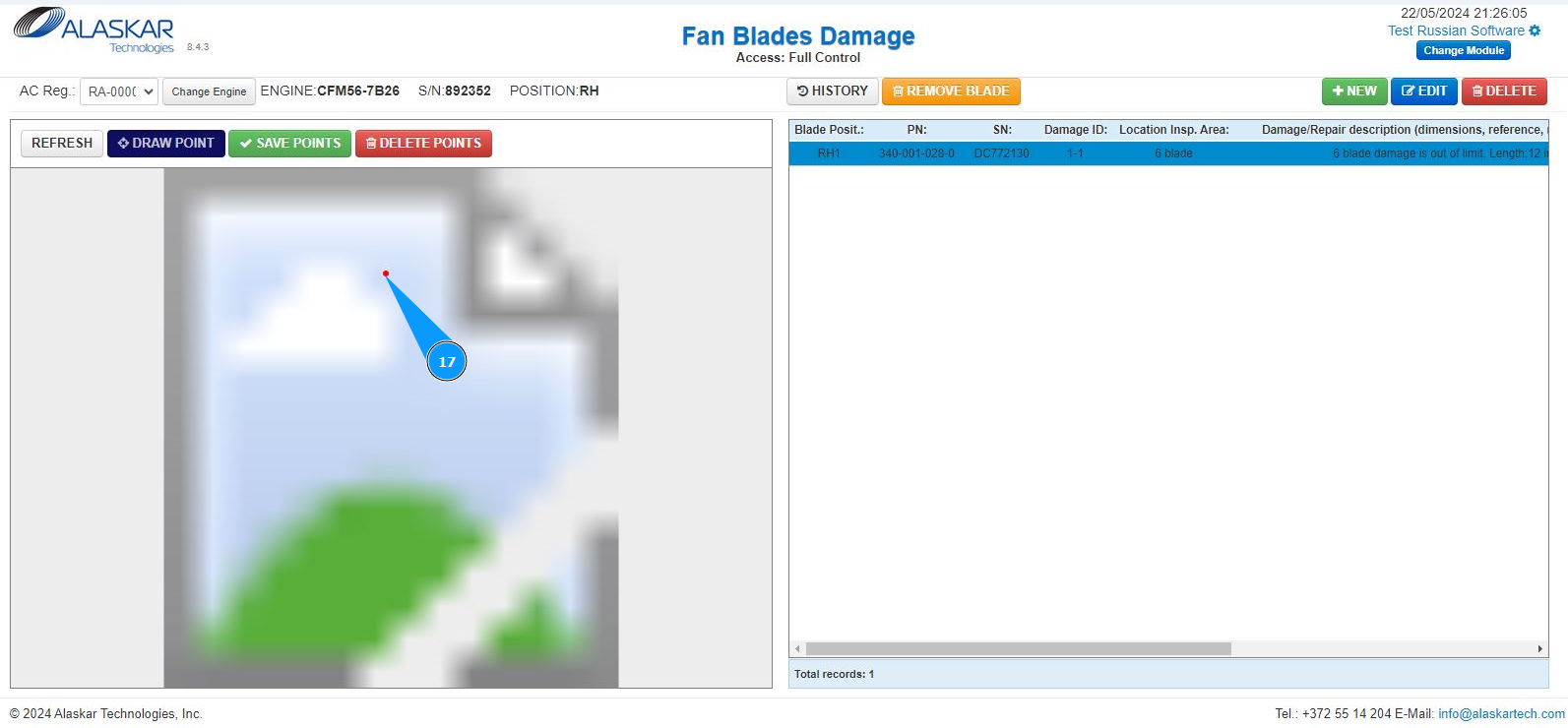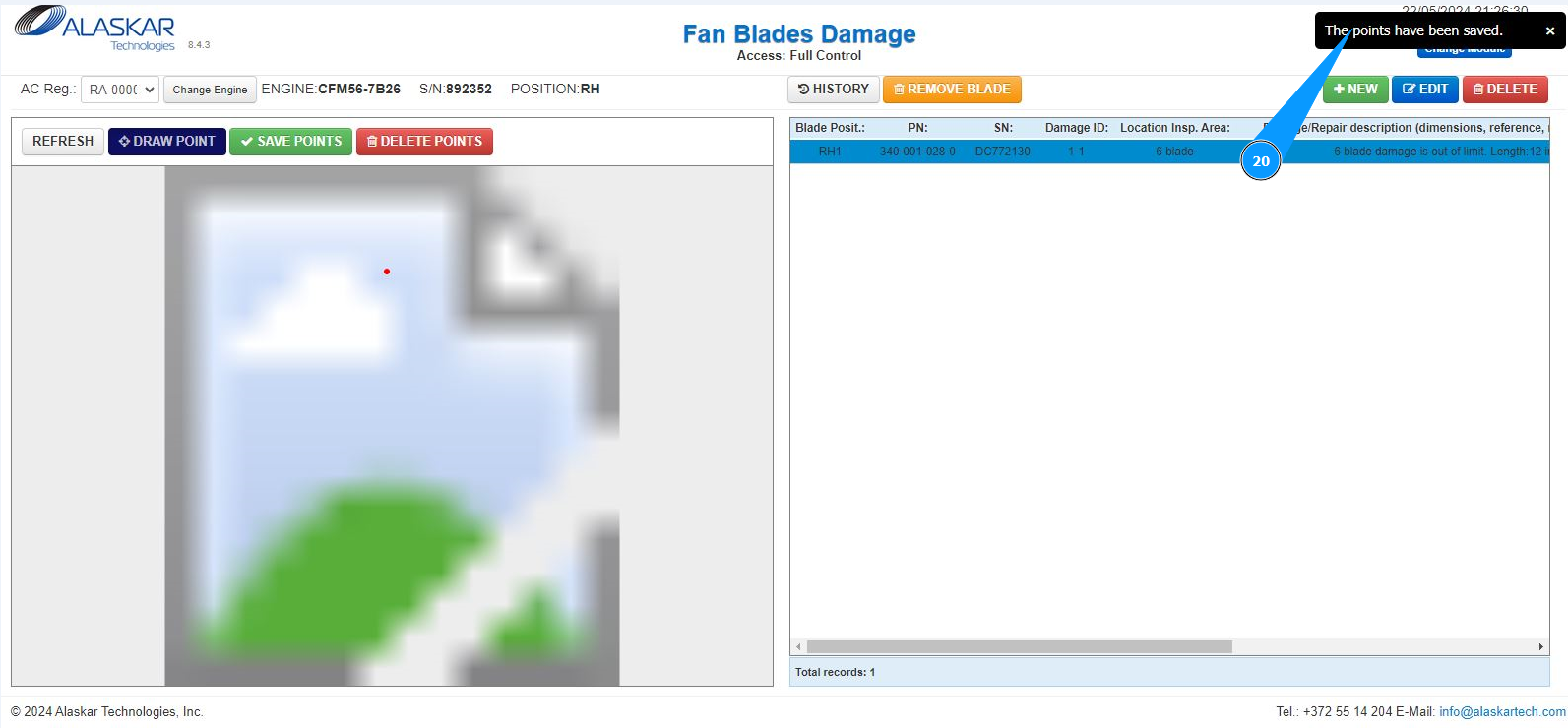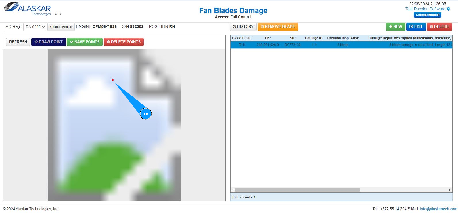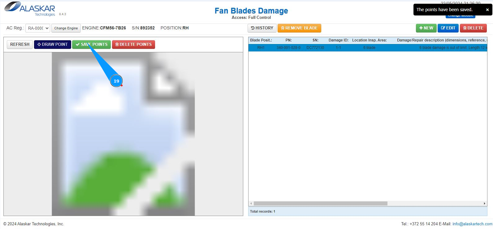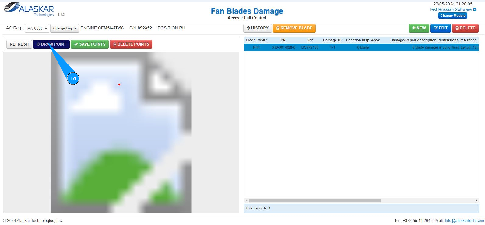 16. Click on the button "Draw Point", to mark the location of the damage on the drawing of the blade.