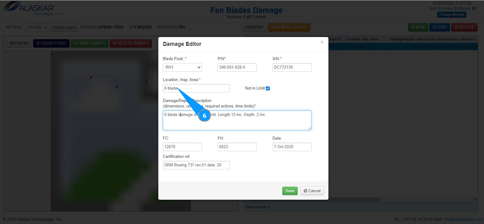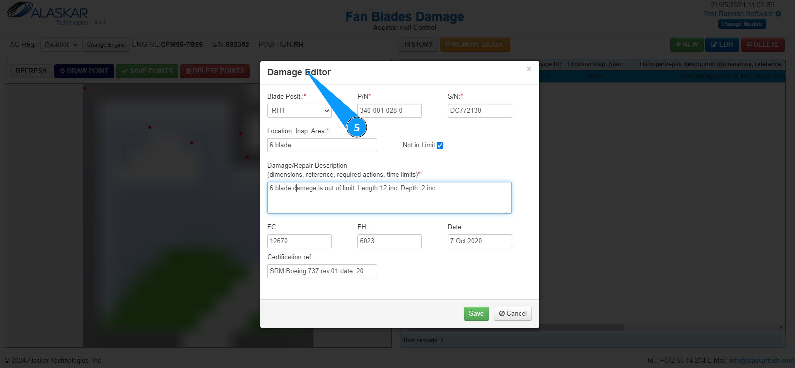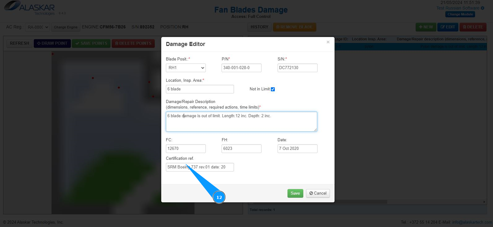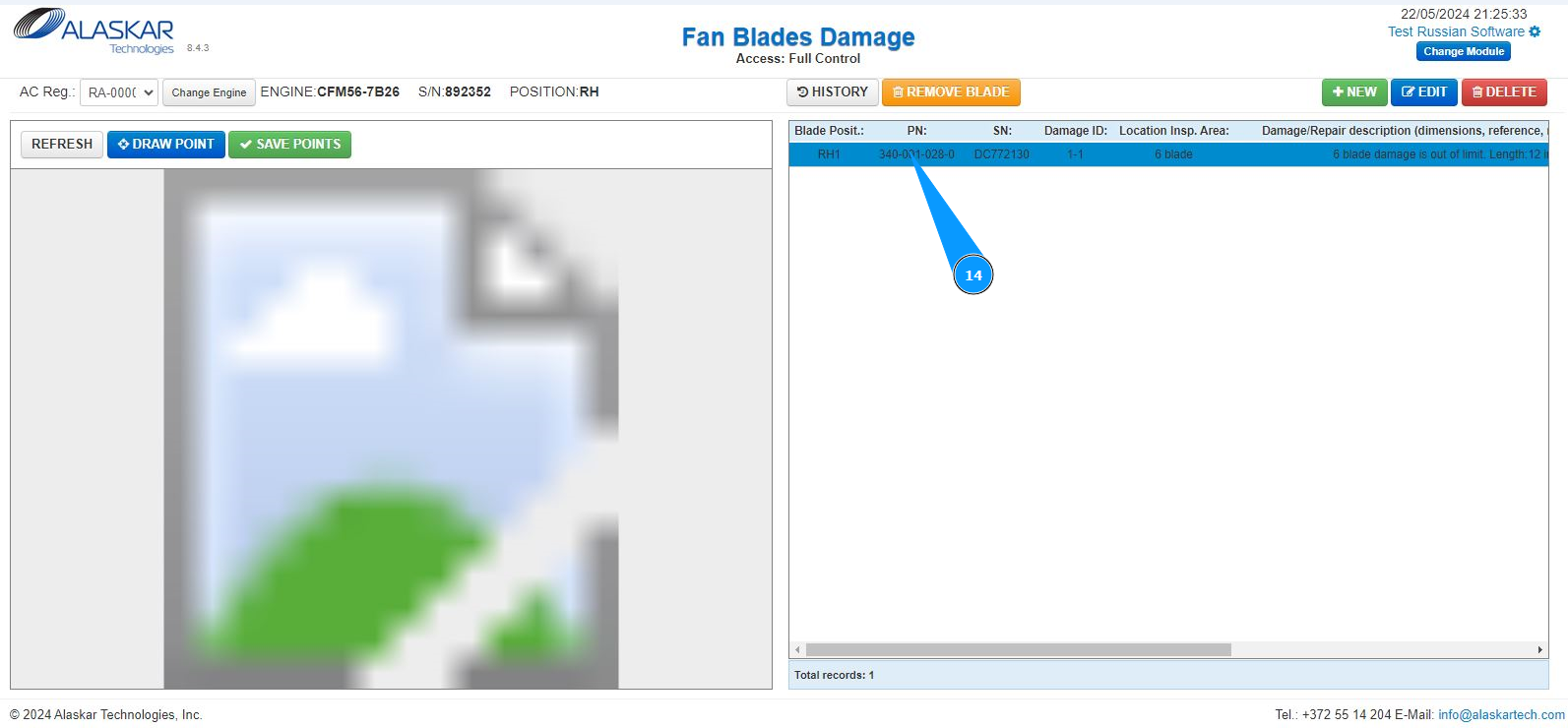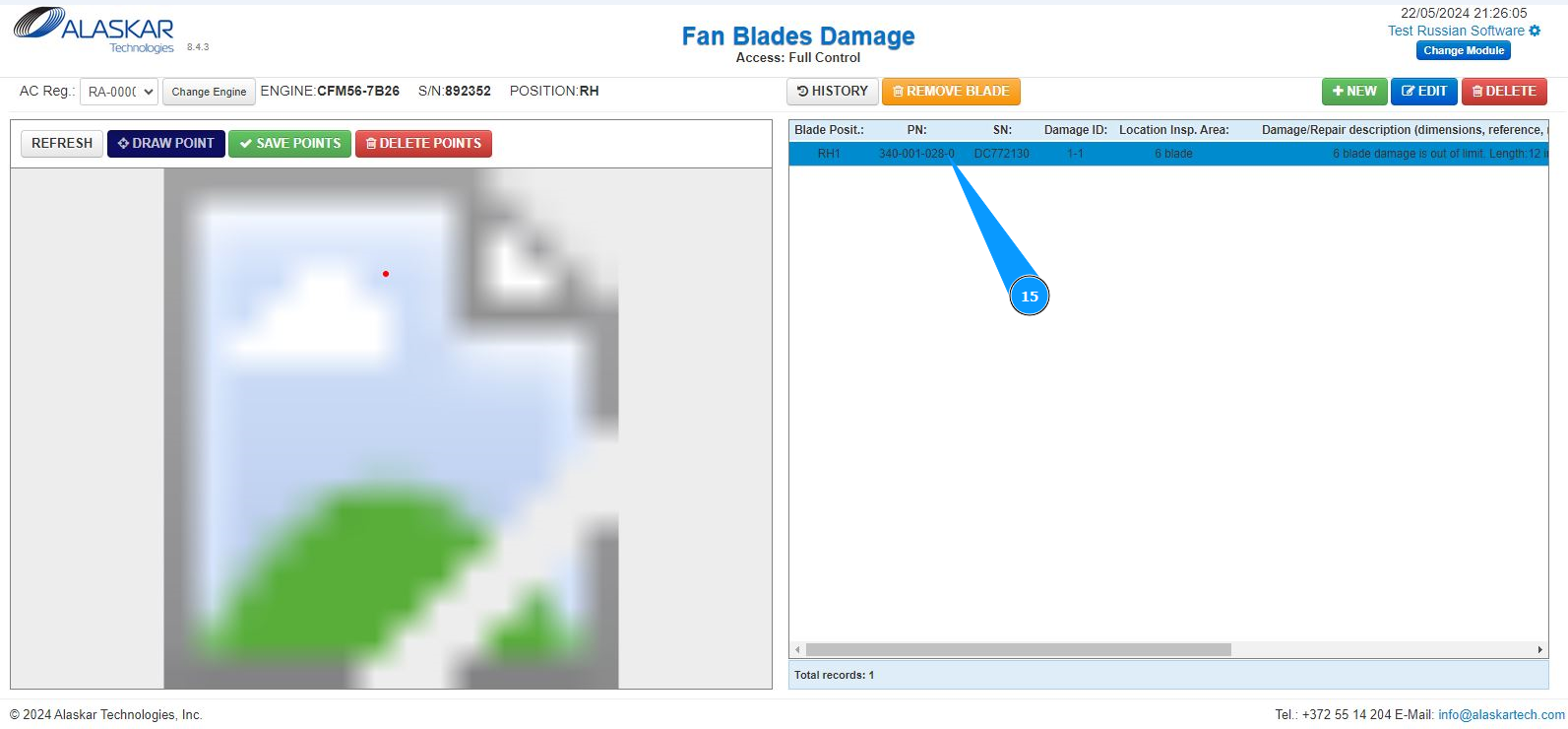16. Click on the button "Draw Point", to mark the location of the damage on the drawing of the blade.