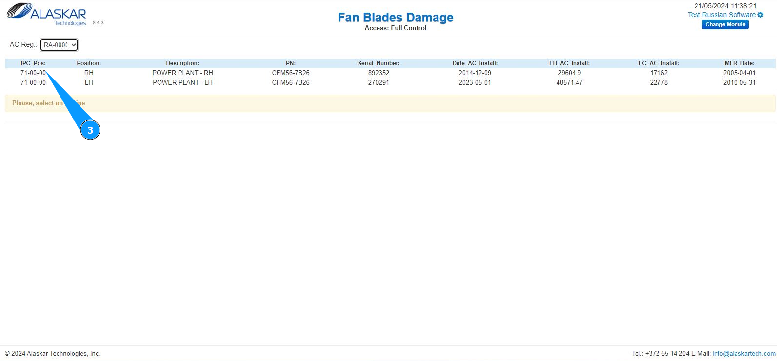 3. Select the required engine to enter information about damage of blades and click on the corresponding line.