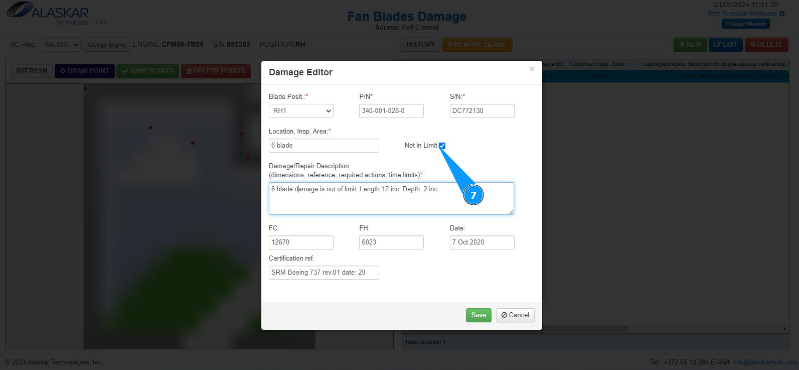 7. If the damage is out of the limits specified in the documentation, tick in the field "Not in Limit".