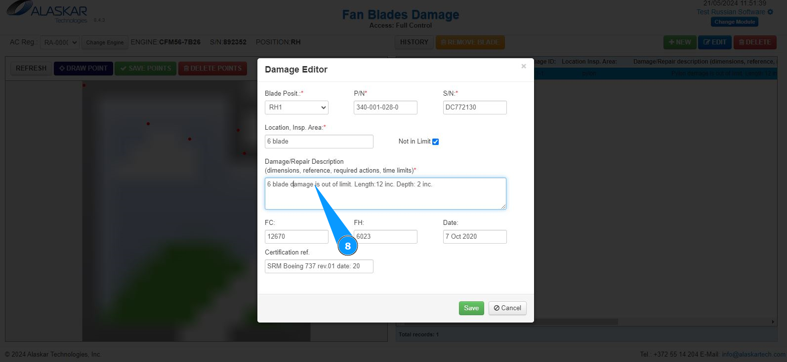 9. If necessary, enter information about the flight hours in which the damage has been identified in the field: "FH".