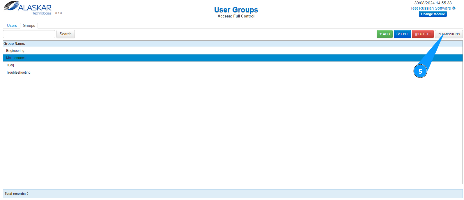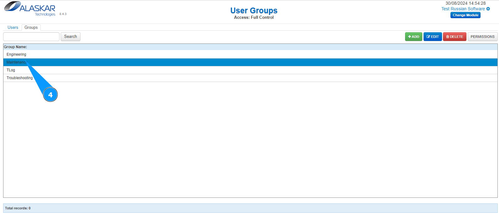 4. Select the group you want to set permissions for from the list, click on the corresponding line.