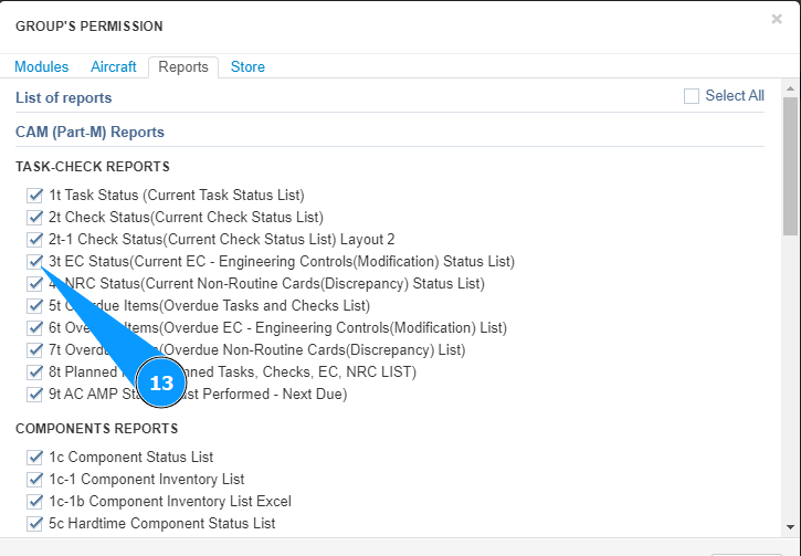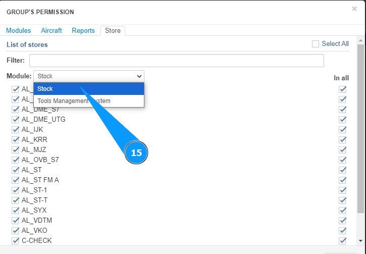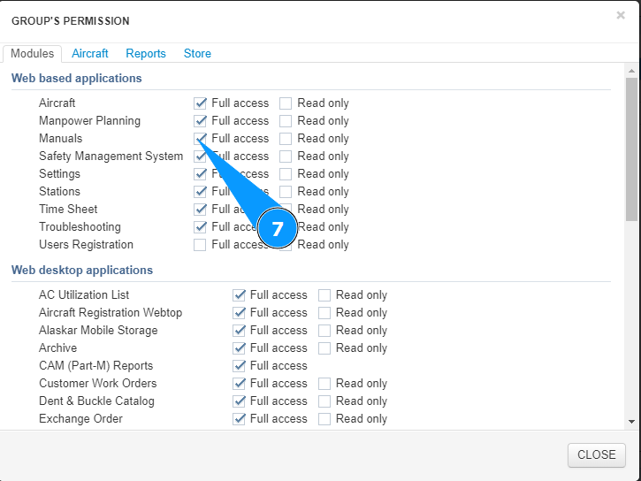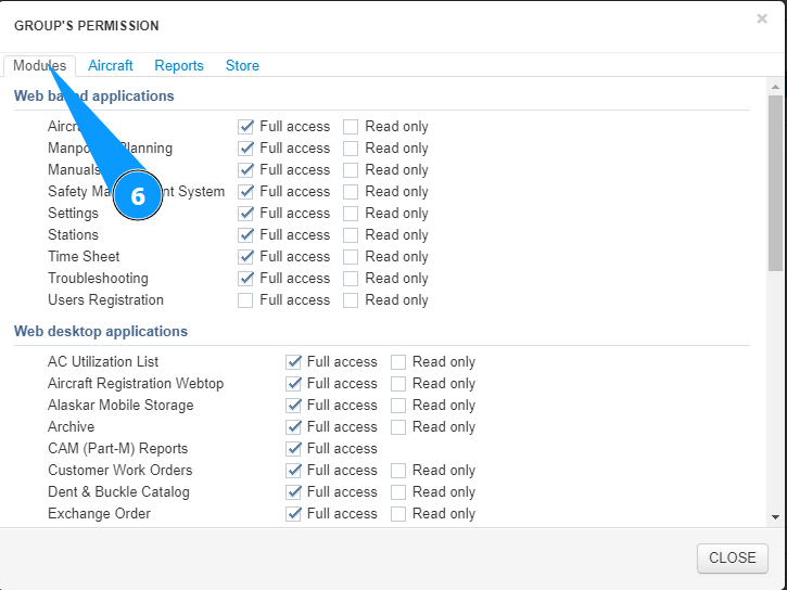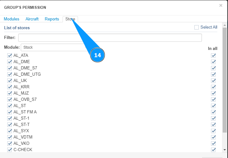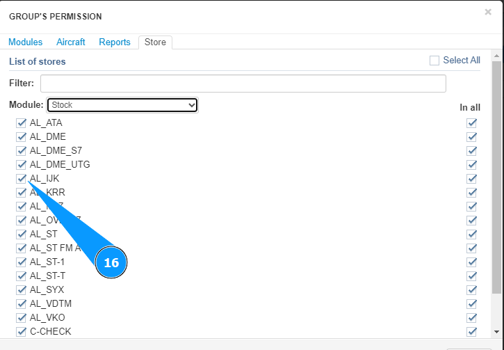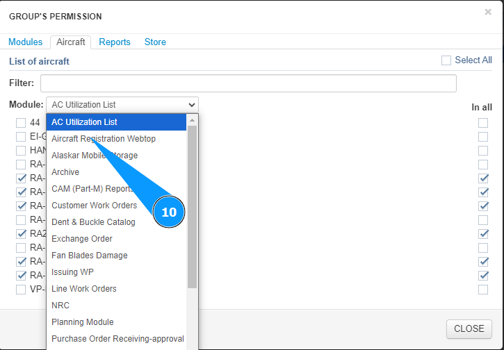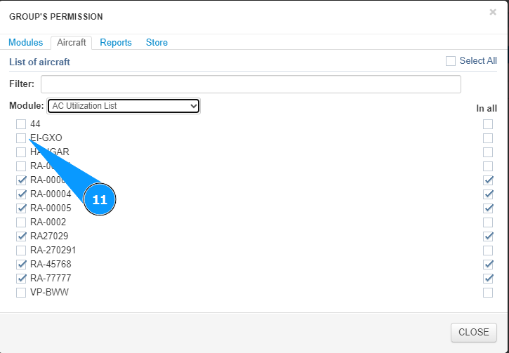 11. Mark the aircraft access allowed for this group in this module, tick in the corresponding window.