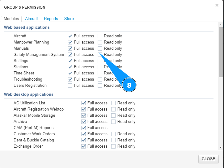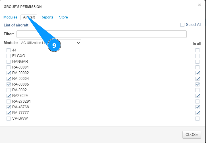 9. Go to the tab "Aircraft" to set permissions for aircraft.