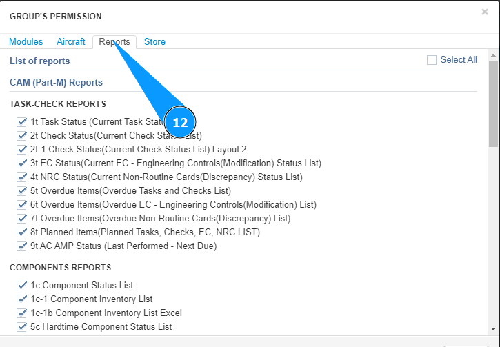 12. Go to the tab "Reports" to set permissions for reports.