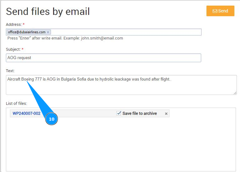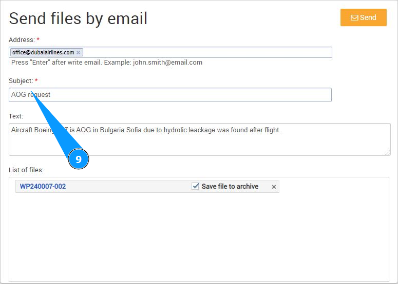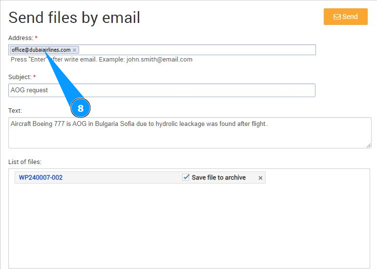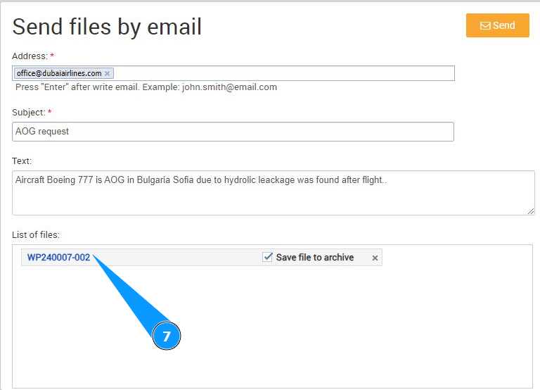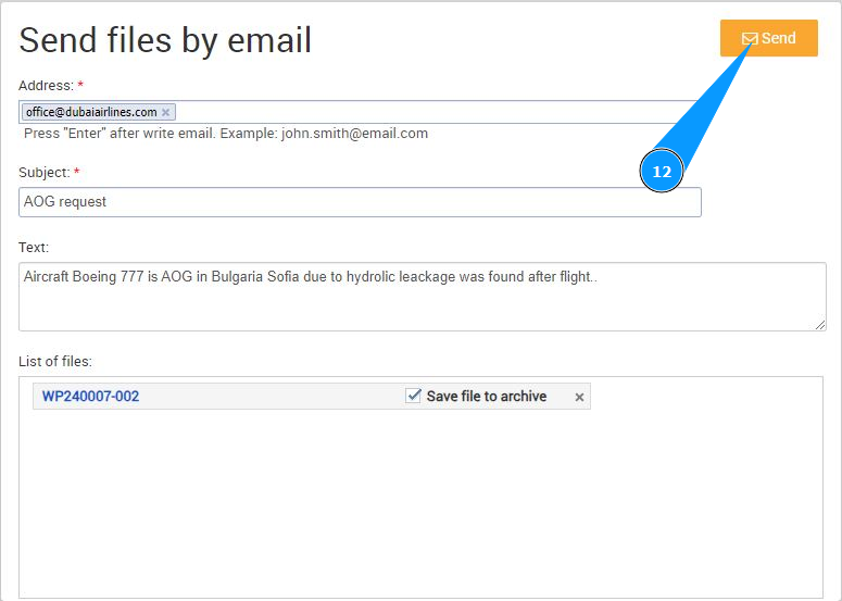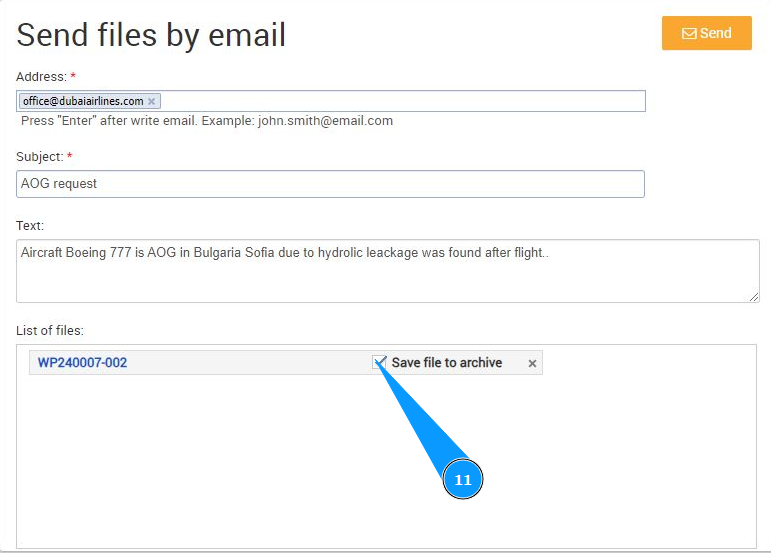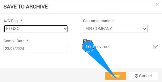 16. Click on the button "Send" to send an email with the file and save the file to the archive.