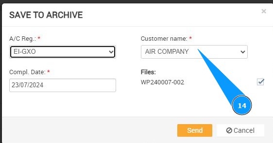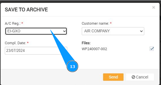 13. If you ticked an additional box to save the file to the archive, select the aircraft registration number from the dropdown list in the field "A/C Reg.".