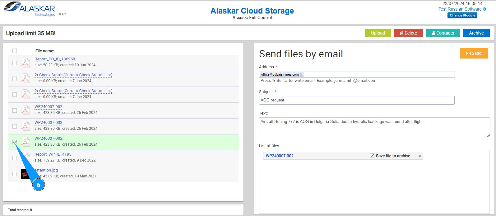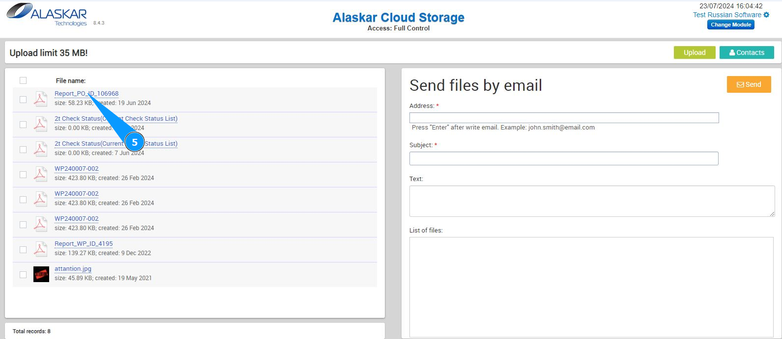 6. You can send the file via email. To do this, click on the required line in the file list window.