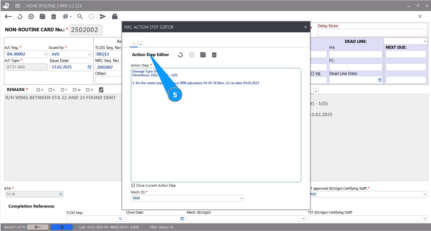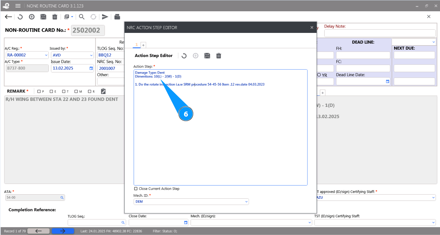 6. Enter the required information for performing the damage action in the field "Action Step".