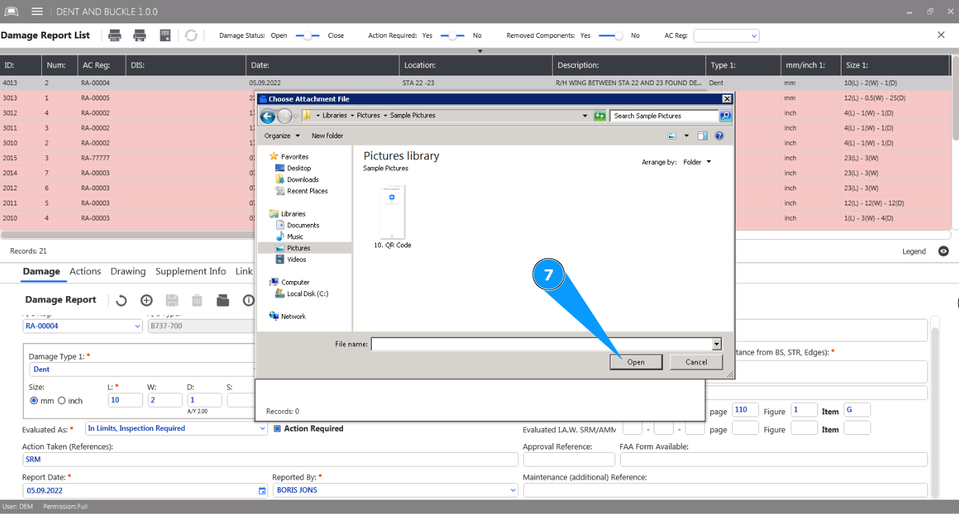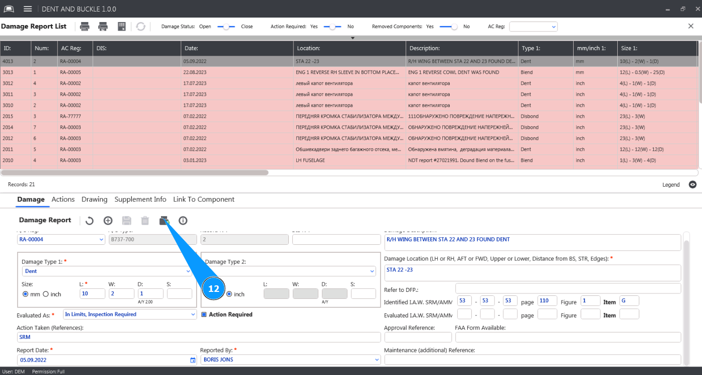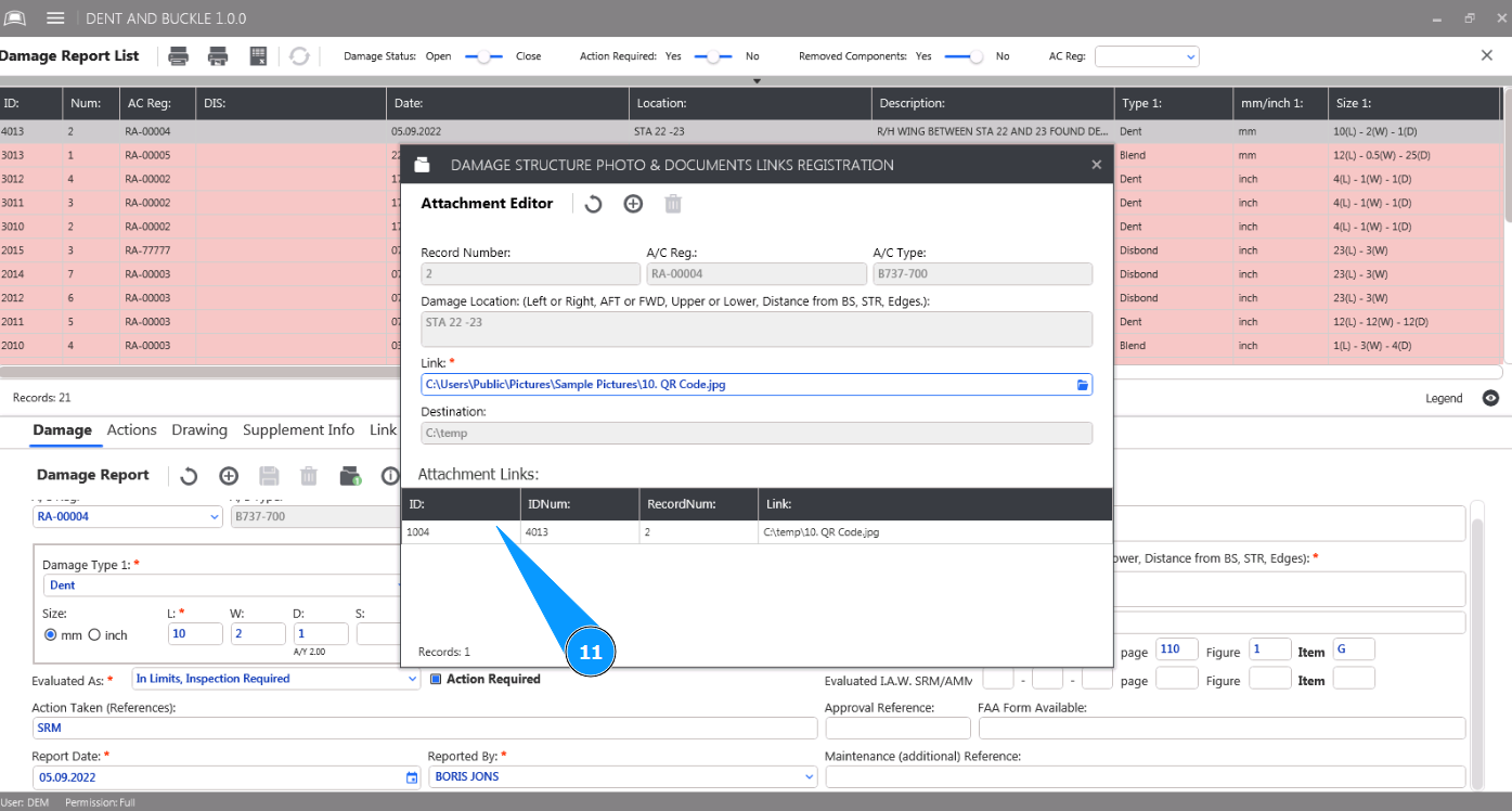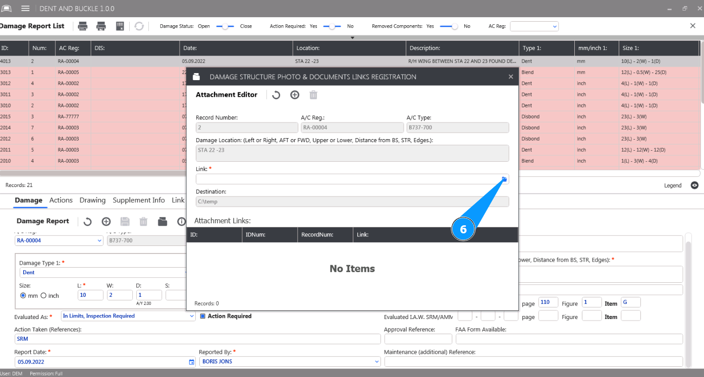 3. Select the damage card from the list for attaching a document and click on the corresponding line in the window "Damage Report List".