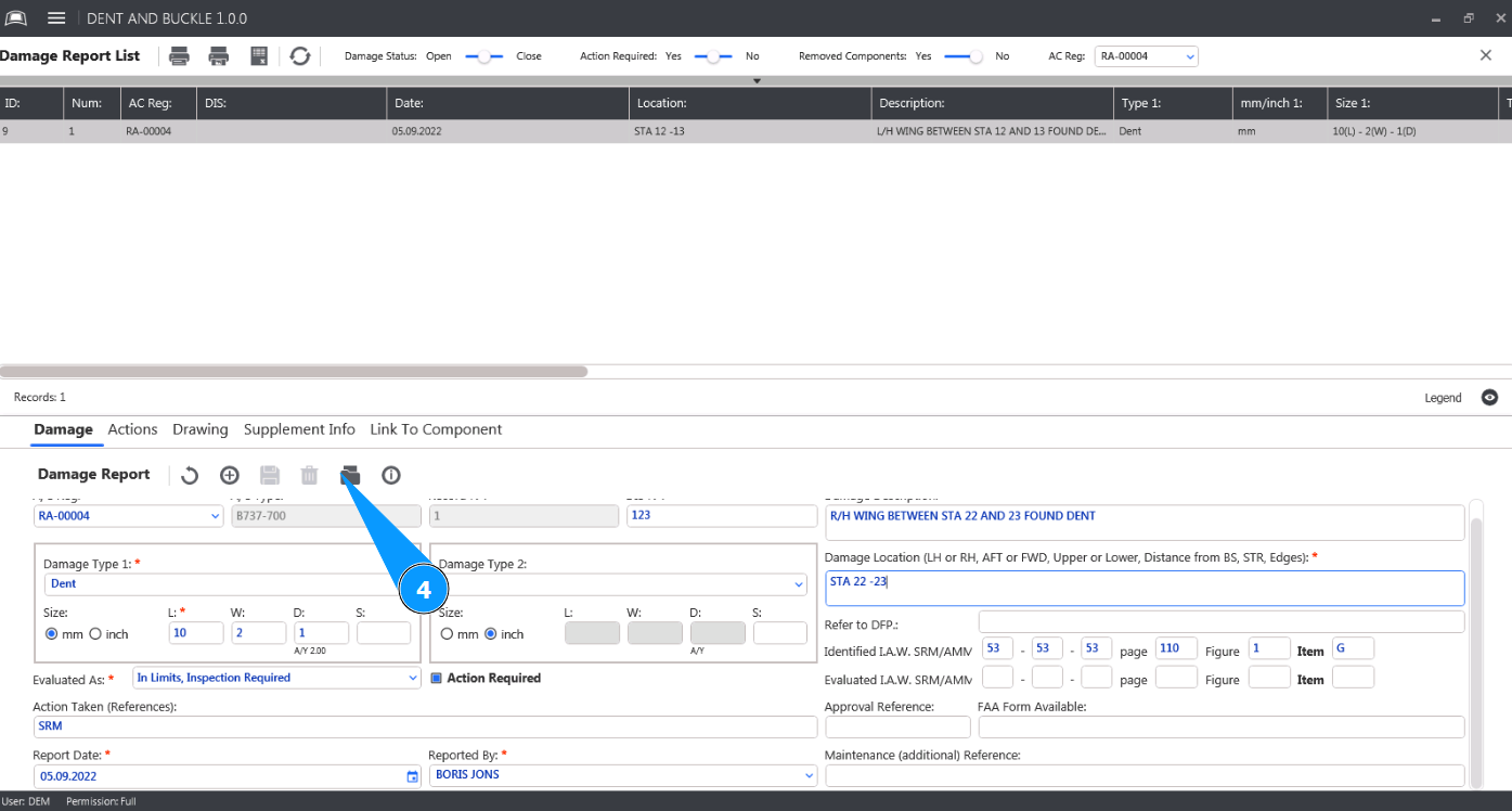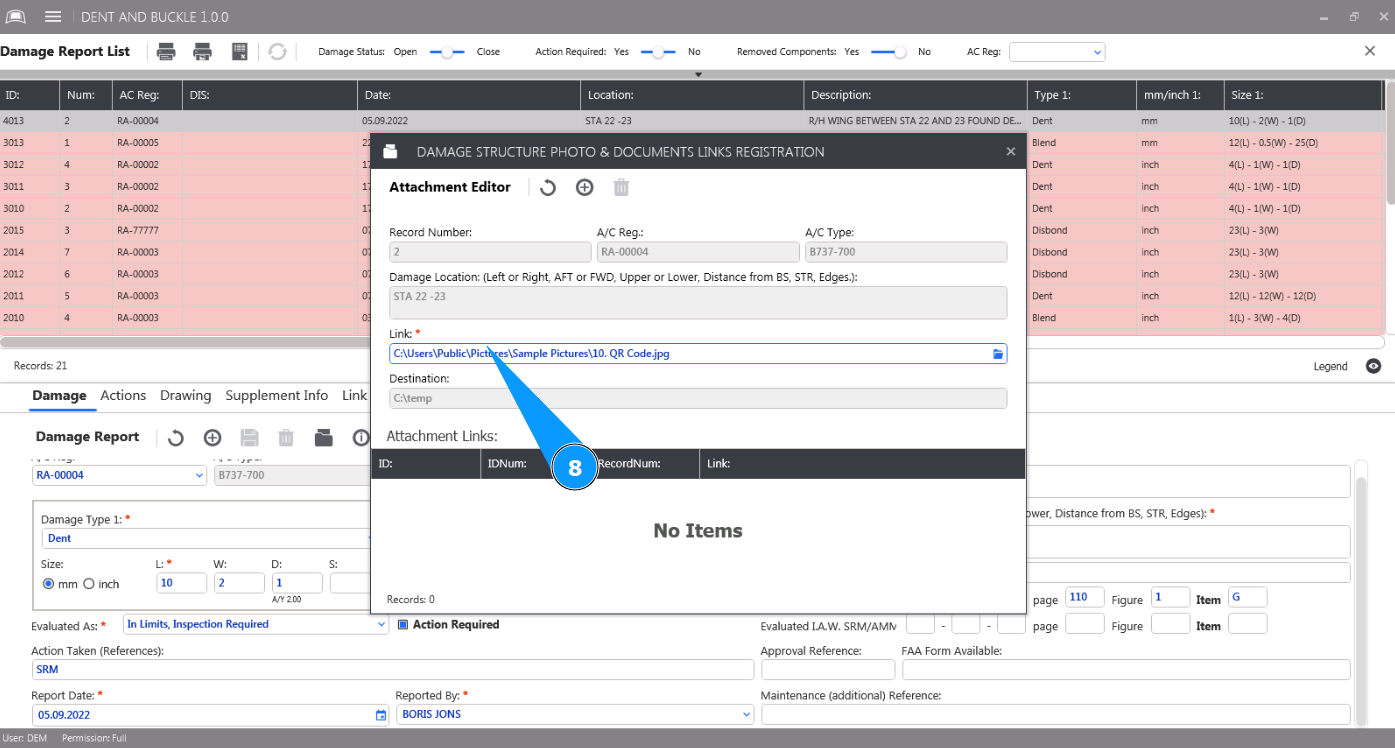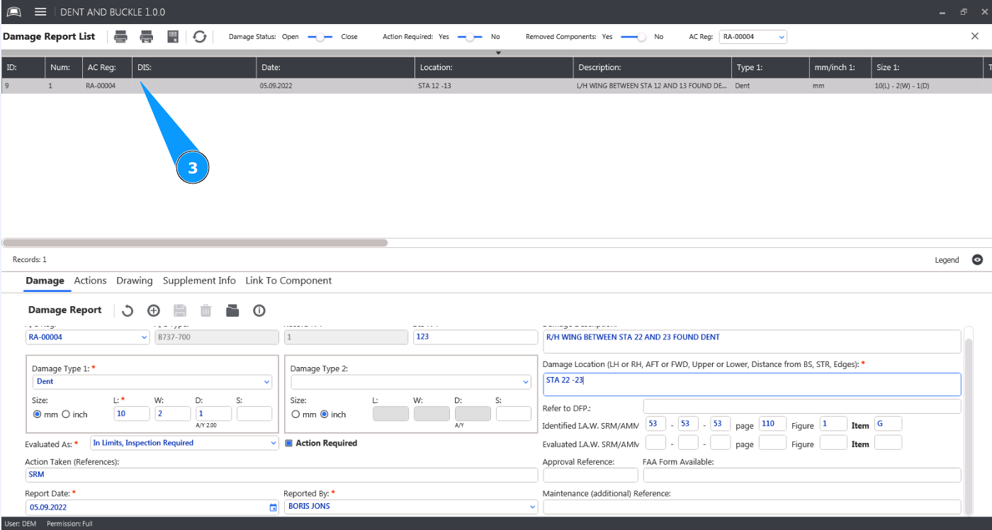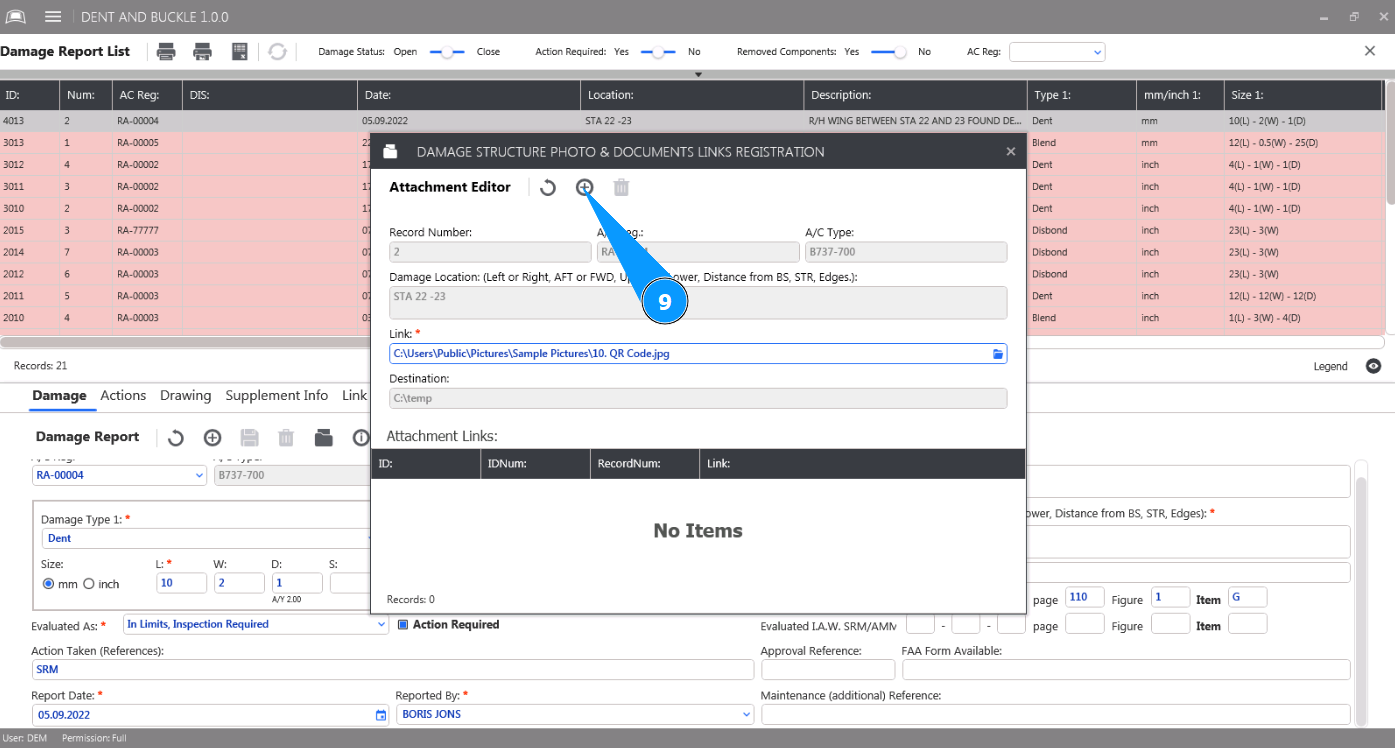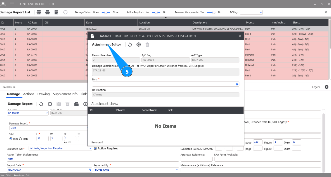 3. Select the damage card from the list for attaching a document and click on the corresponding line in the window "Damage Report List".