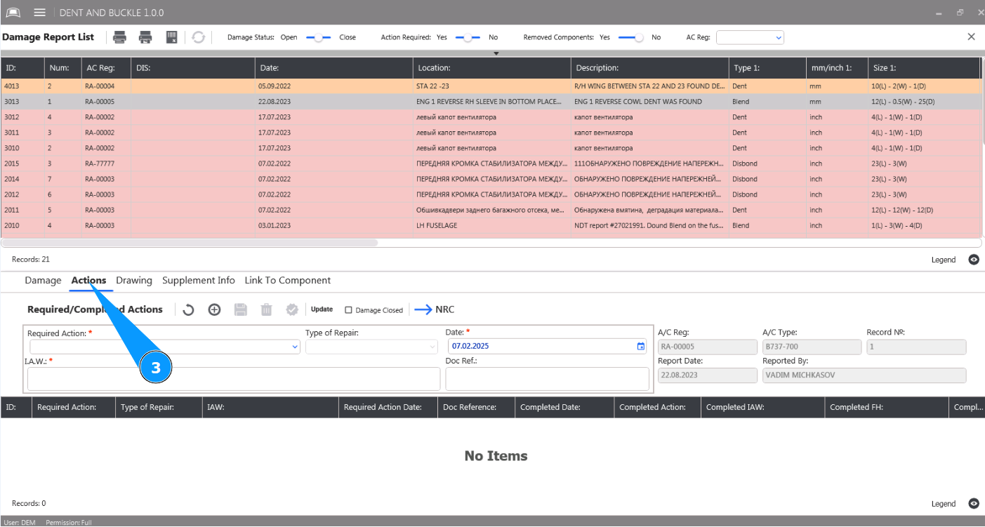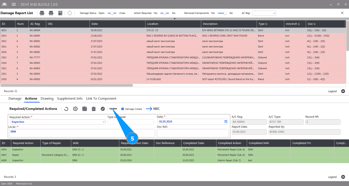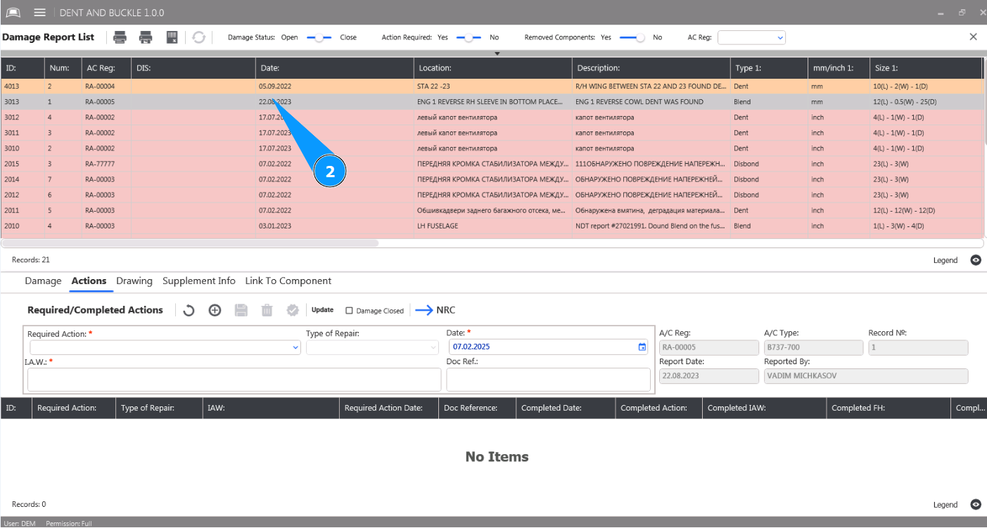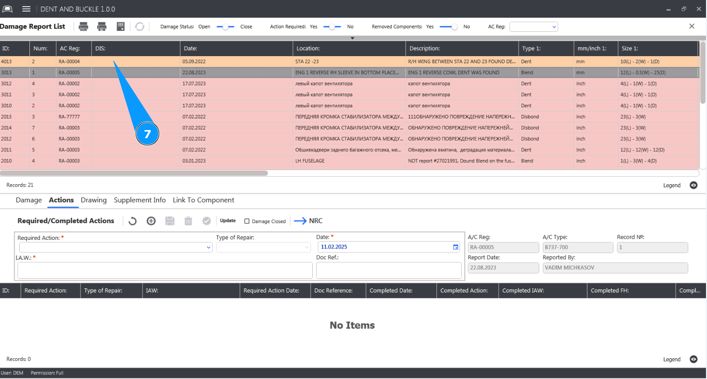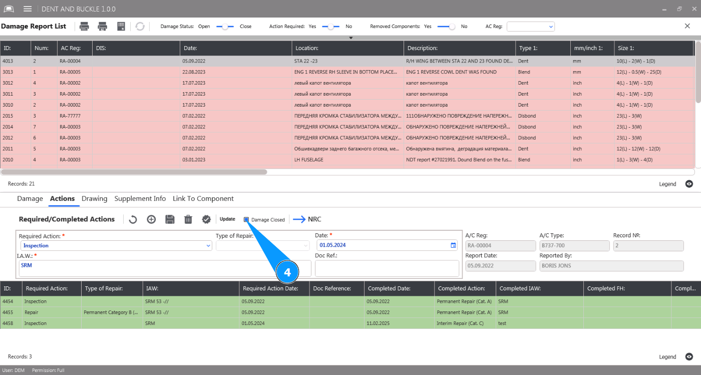 7. Check that the closed damage has changed color to peach in the window "Damage Report List".