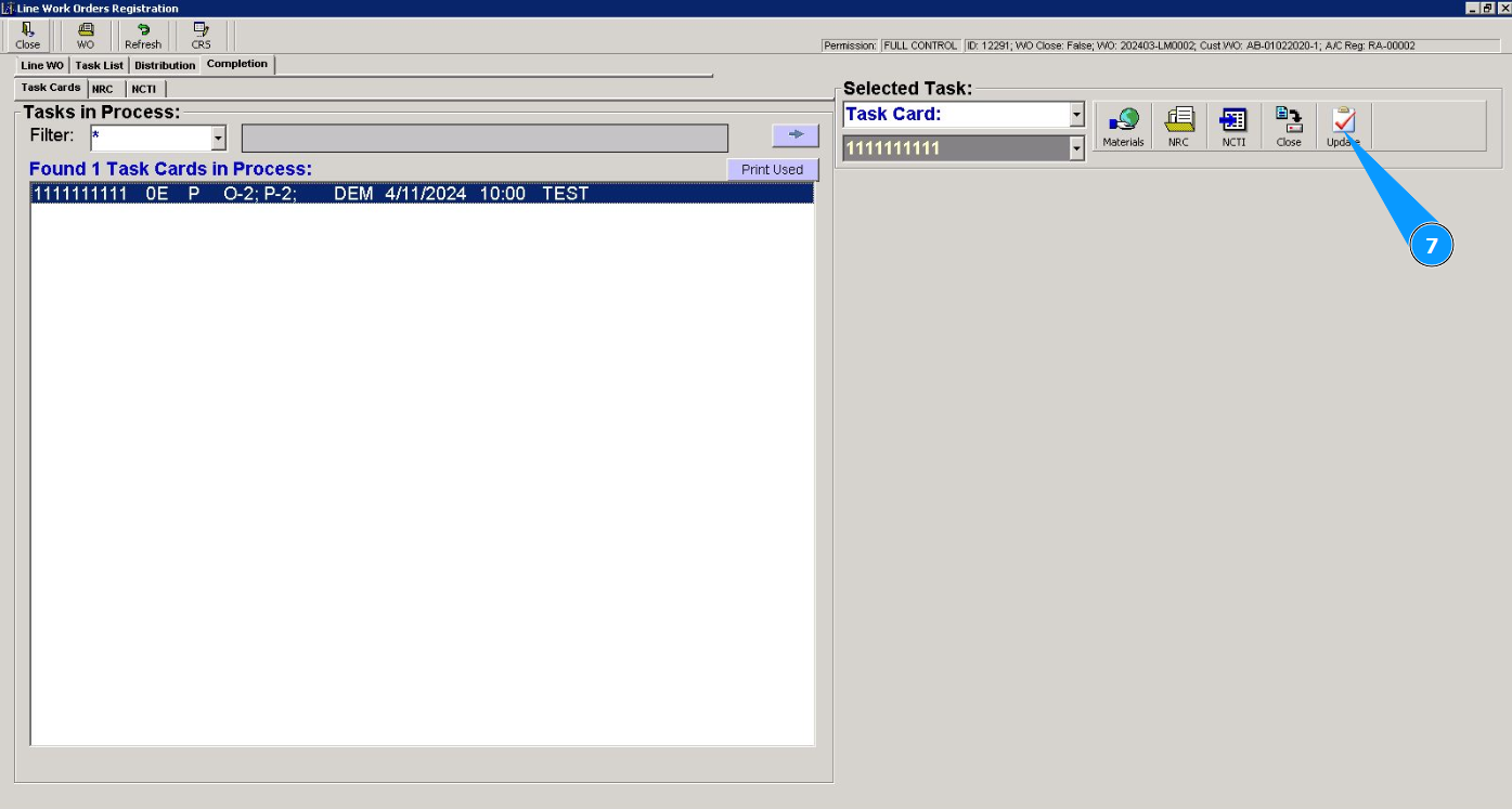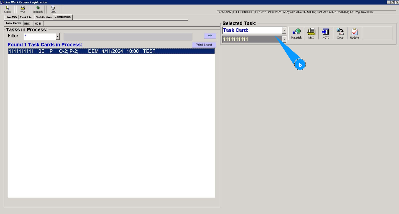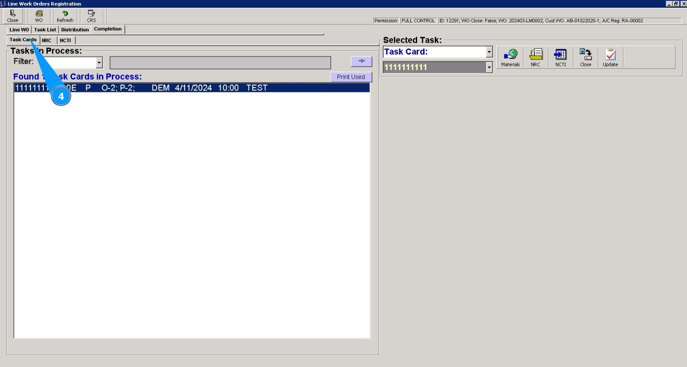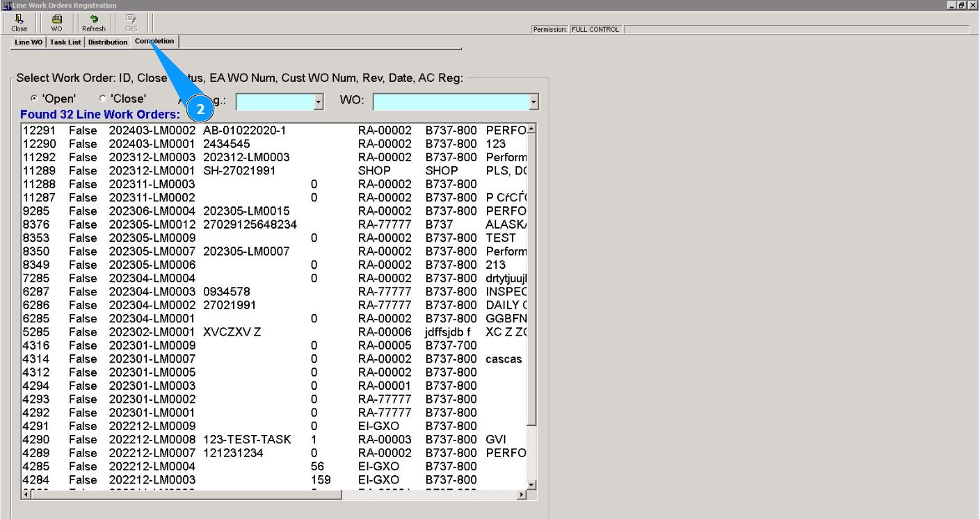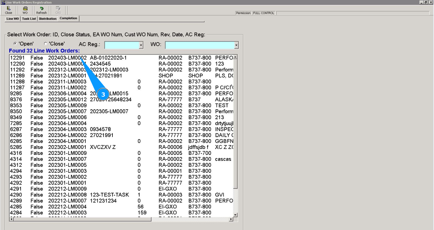 3. Select the WO number required for adding man-hours from the list in the window "Line Work Order List". Click on the corresponding line. Note: If necessary, use the search filters, fields: "AC Reg.", "WO".
