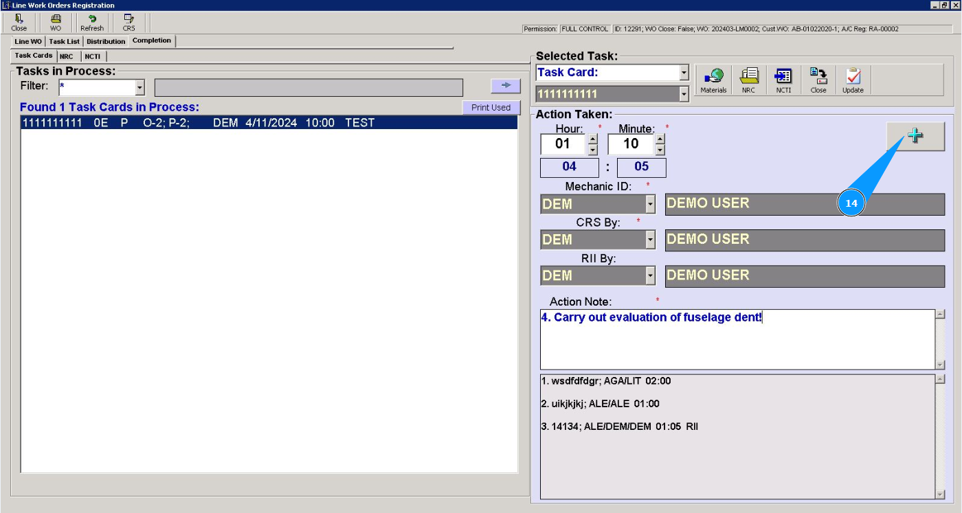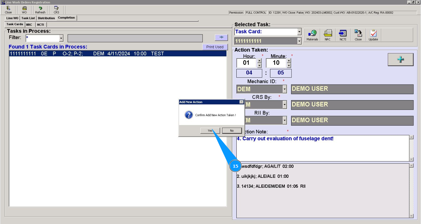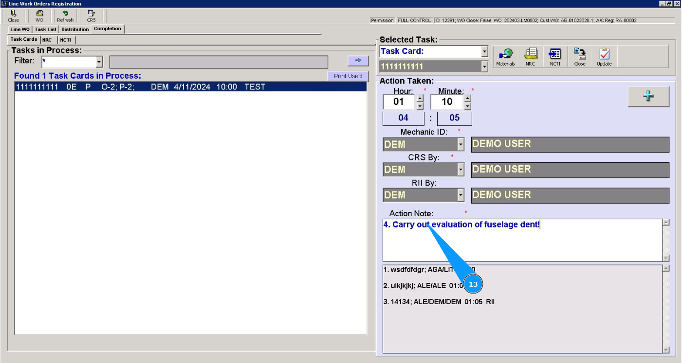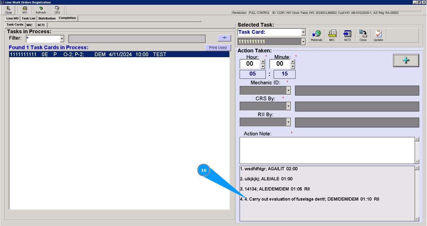 16. Check that the new line with the entered man-hours is displayed in the recorded entries in the field "Action Note".