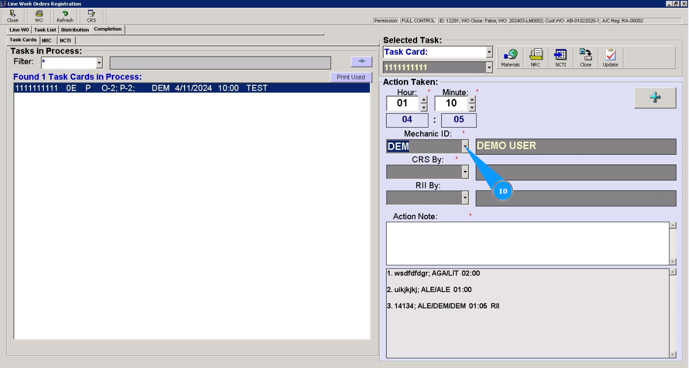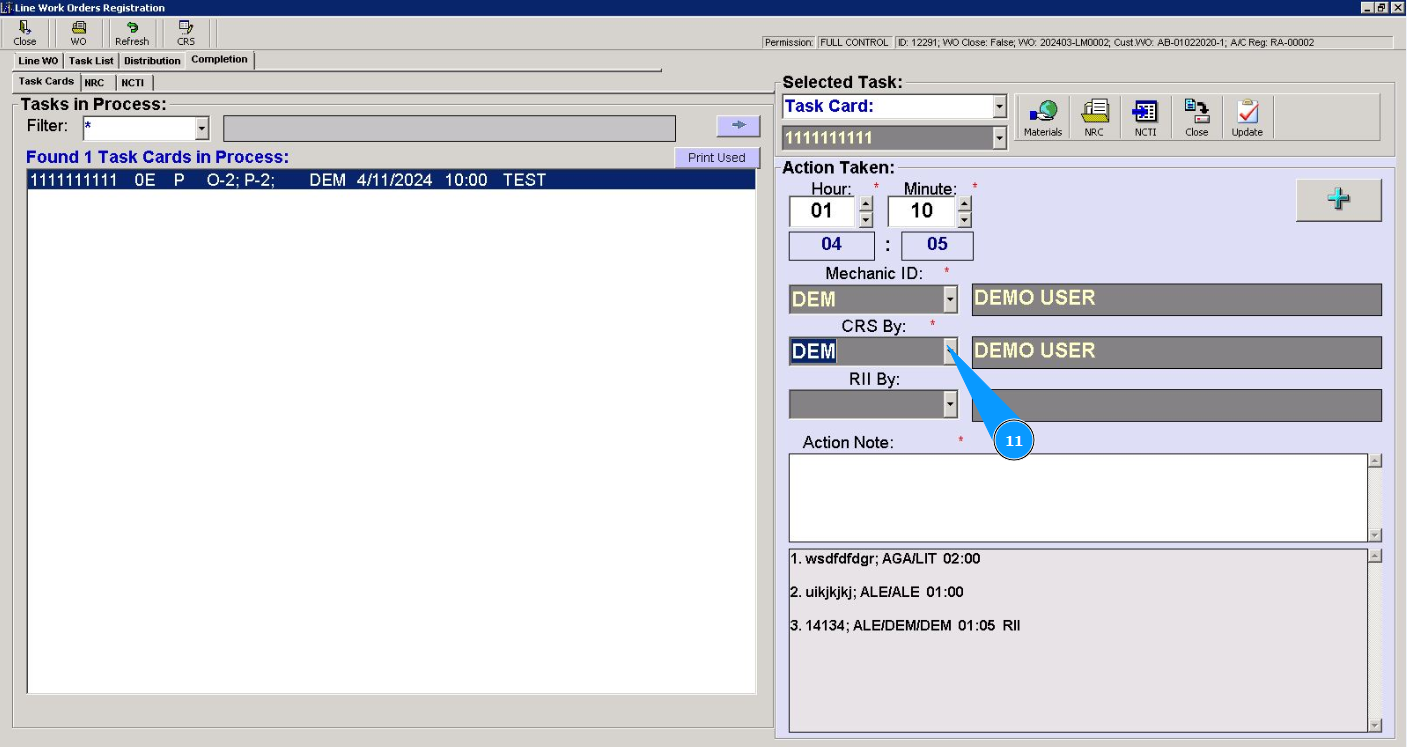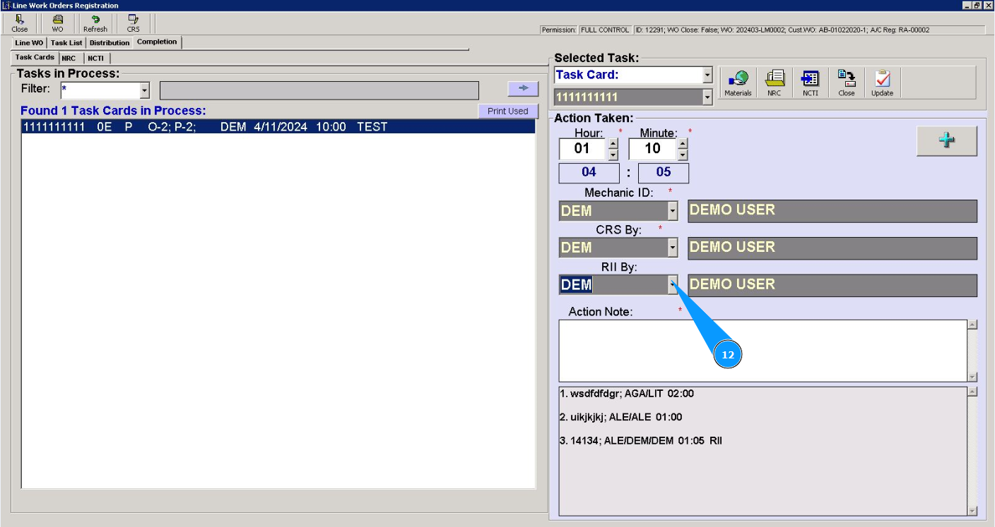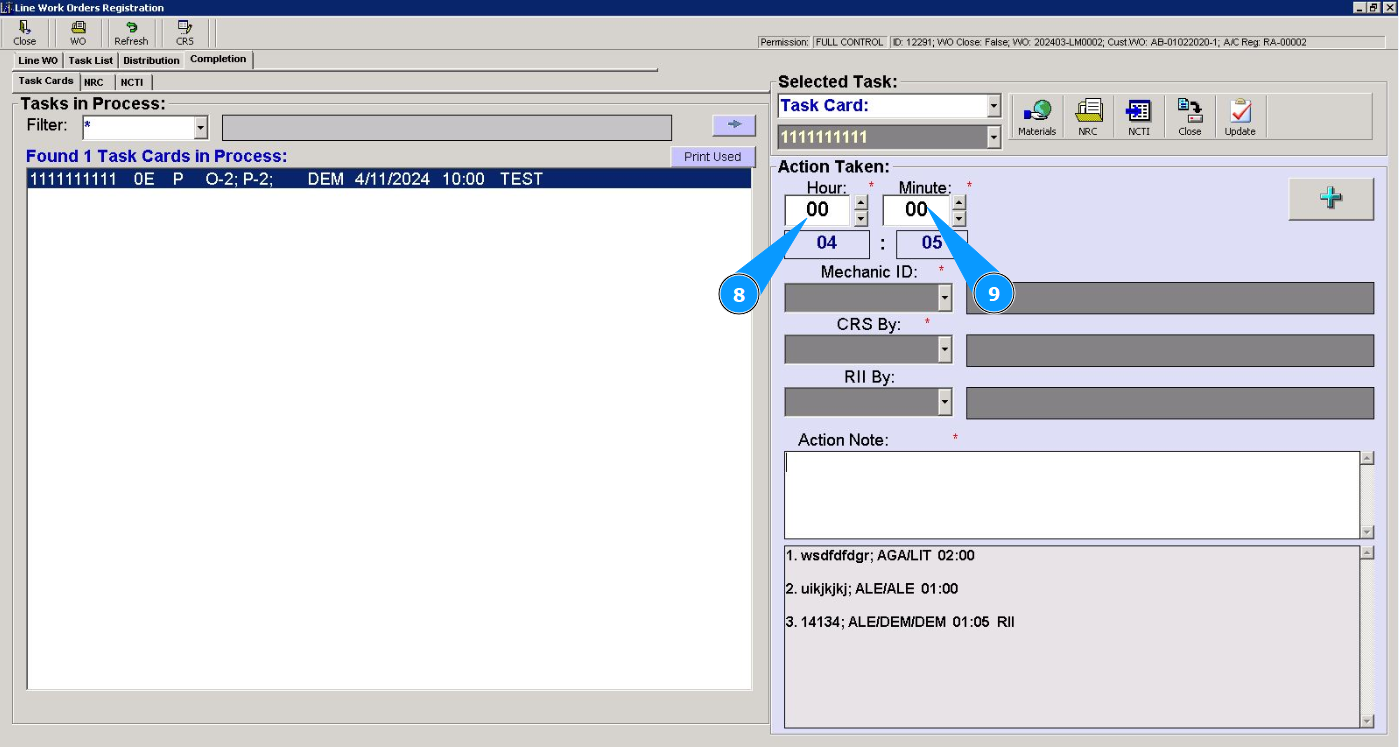 16. Check that the new line with the entered man-hours is displayed in the recorded entries in the field "Action Note".