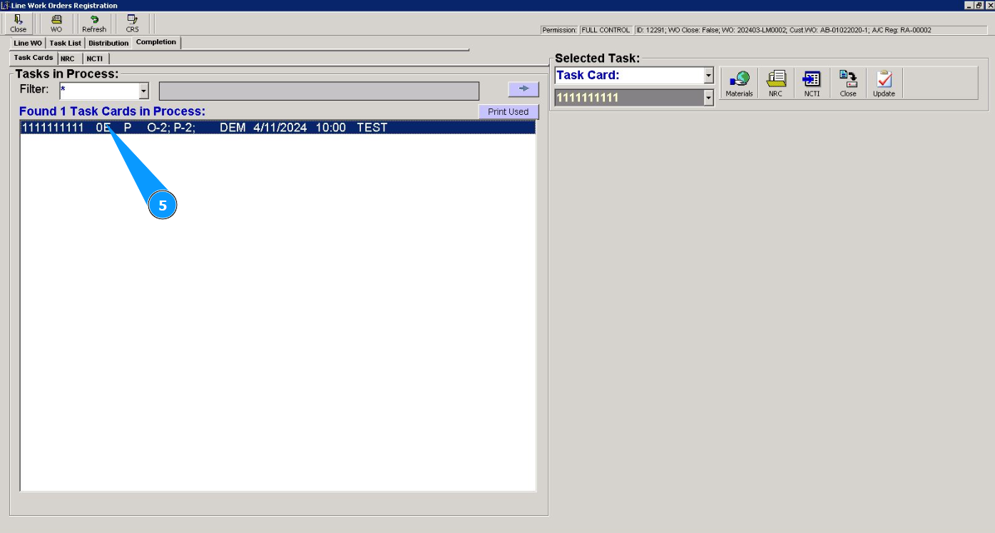 5. Select the required task number for adding man-hours from the list in the window "NRC List". Click on the corresponding line for the task. Note: If necessary, use the search filters, field: "Filter".